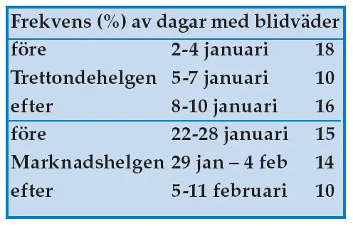 Observationerna ger som synes inte något som helst stöd för att blidvädersperioder är speciellt vanliga vid dessa helger. Det råkade till och med vara ovanligt få blida dagar, bara 14 (10 procent), den 5-7 januari, medan motsatsen gällde 127 dagar.