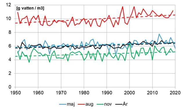 Tio stationer i Sverige med i stort sett kompletta tidsserier för perioden 1951 – 2019 har valts ut från Bredåkra i söder till Arjeplog i norr. Medelvärdet av den absoluta fuktigheten från dessa stationer har ökat under perioden 1951-2019 för maj, augusti och för årsvärdet, se figur nedan. Orsaken till ökningen är att det blivit varmare och avdunstningen har därmed ökat.