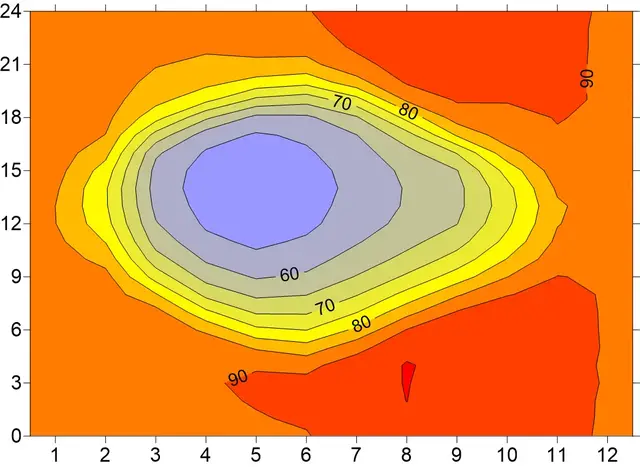Arvika. Relativ fuktighet [%], variation under månad (x-axel) och under dygn (y-axel), medelvärden 1996-2019.