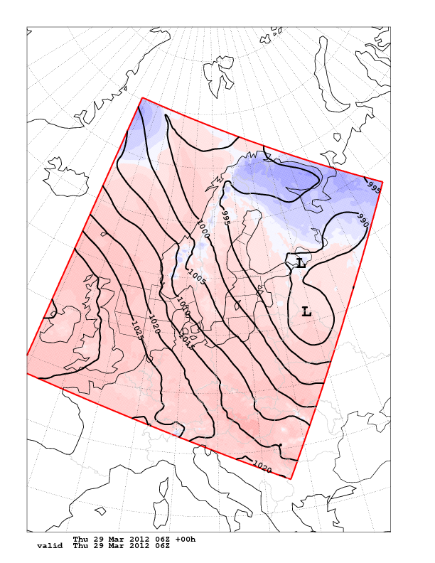 Förstora bildenMesanområdet täcker en stor del av norra Europa. Här visas lufttryck (isolinjer) och temperatur (färgade områden) för 29 mars 2012 kl 6 UTC.