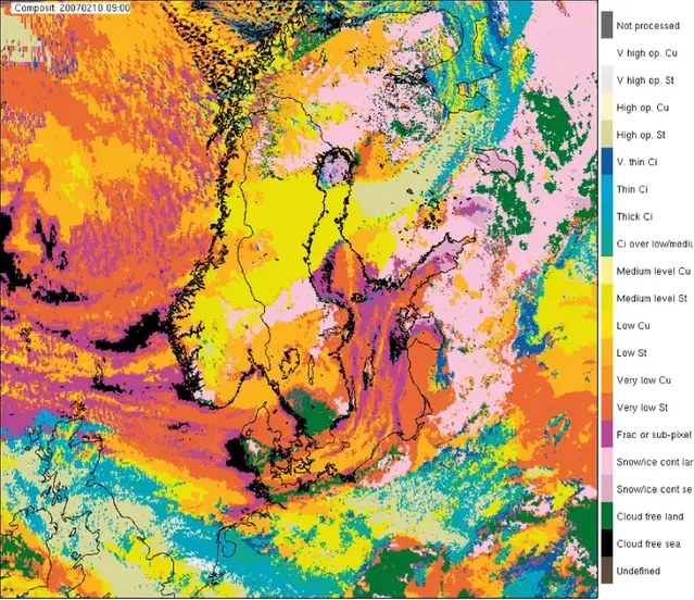 För varje timme skapas den bästa möjliga sammansatta tolkningen av molnslag (se bild). Det är sedan den informationen som är ingångsdata till modellen MESAN för beräkning av den totala molnigheten.