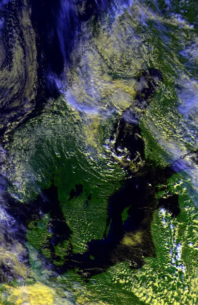 Satellitbild och väderkarta motsvarande bilderna ovan