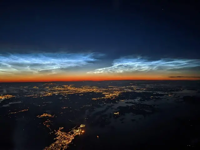 Nattlysande moln fotograferade från flygplan av en pilot natten mot den 29 juli 2022. Längst ner i bild syns Nynäshamn och högre upp centrala Stockholm.