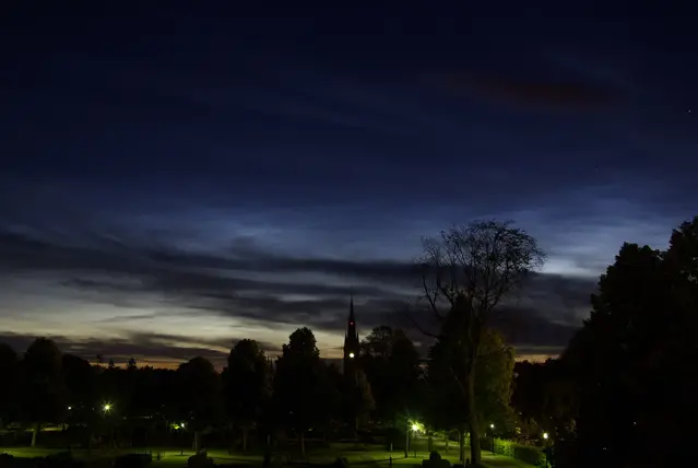 Nattlysande moln över Norrköping, 17-18 juli 2013. Notera den mörka natthimlen högst upp och det blåvita silvriga utseendet hos de nattlysande molnen. Närmre horisonten får de nattlysande molnen en mer gulvit ton där de blandas med skymningsljuset. I förgrunden ligger lägre moln som är mörka eftersom solen inte lyser på dem.