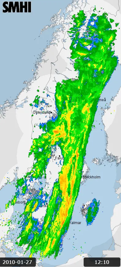 Radarekon för snöfallet den 27 januari 2010 kl 12.10. Nederbördsområdet rörde sig från väster mot öster.