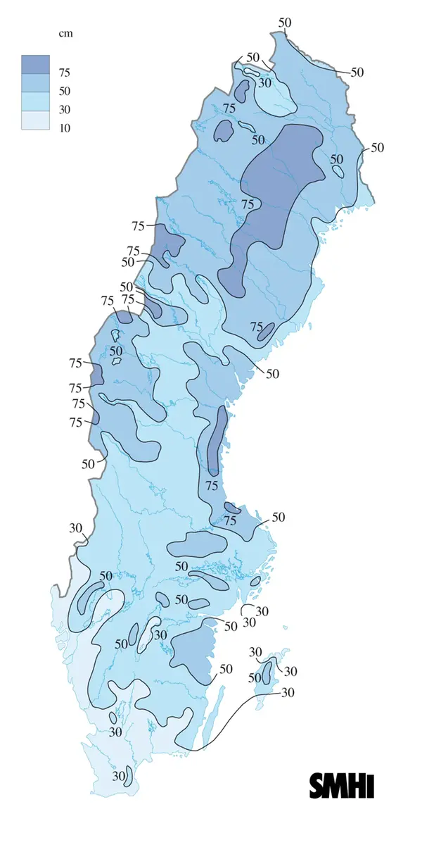 Snödjup 2010-01-15. Vid denna tid gjordes endast snödjupsanalyser den 15 och den sista i varje månad under snösäsongen.