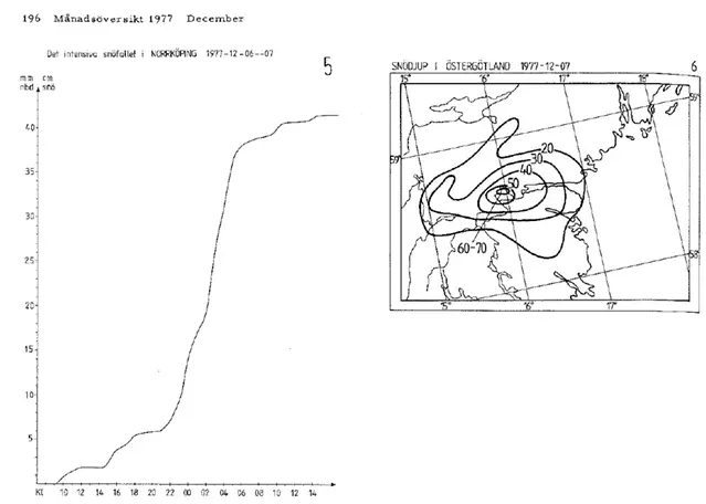Förstora bildenSnödjup den 7 december och snödjupsökning under ovädret 6-7 december 1977 i Norrköping.