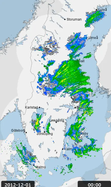 Förstora bildenRadarekon kl 00 den 1 december 2012. Snöbyarna mot Skellefteåtrakten fortsatte under dagen. Vid södra Norrlandskusten hade snöandet börjat redan dagen innan.
