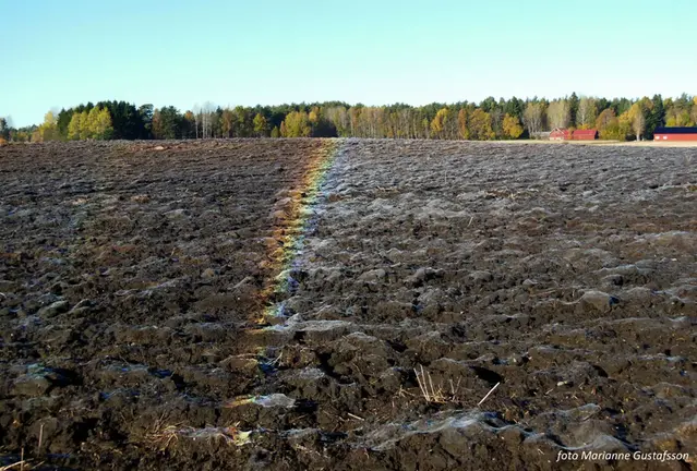 Eftersom regnbågen uppstår genom ljusets brytning och reflektion i droppar måste frosten som låg på marken tinat i de solbelysta delarna av plogfårorna och bildat små droppar.