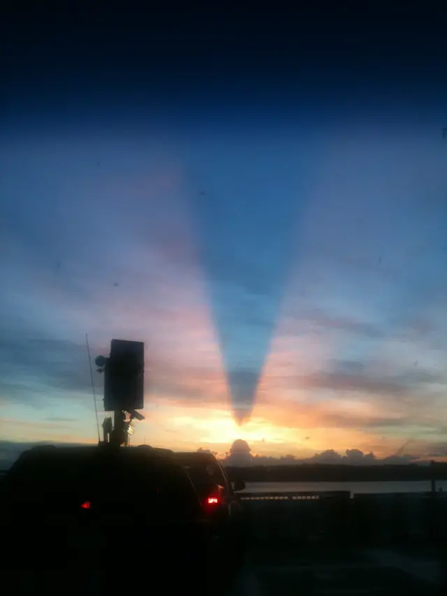 Fenomenet på bilden är en variant av skuggstrålar. Flertalet skuggstrålar brukar synas i riktning mot solen. Den på bilden har solen i diametralt motsatt riktning.