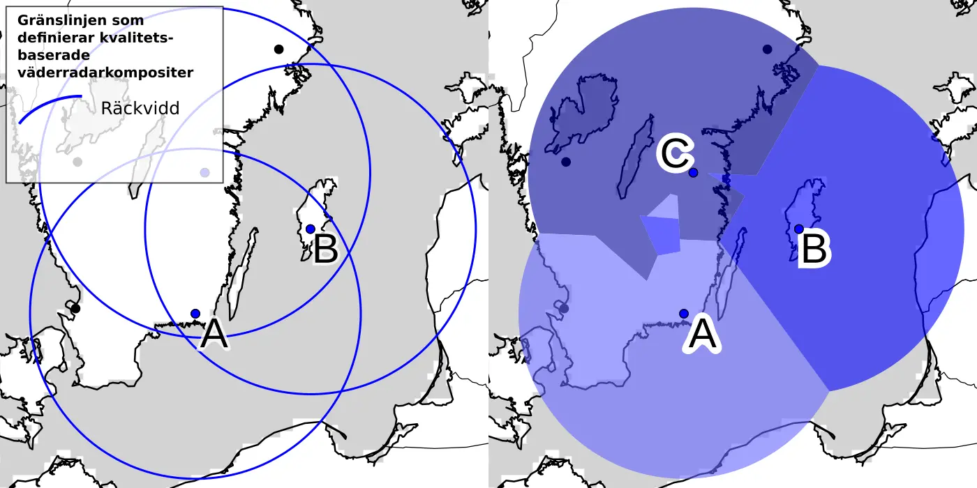 Figur 1 illustrerar områden med överlapp och hur ett möjligt bidrag från respektive anläggning kan bli i en komposit. Figur 2 visar ett exempel på hur bidraget från tre radaranläggningar ser ut i ett utsnitt från en komposit.