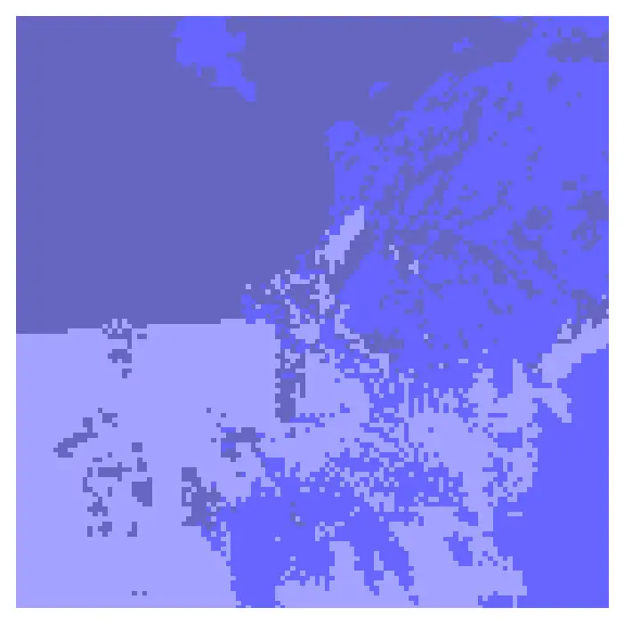 Figur 2: Ett exempel på tre radaranläggningars bidrag i ett utsnitt av en komposit. Varje datapunkt i detta fall motsvarar en ruta omkring 2x2 kilometer i verkligheten.