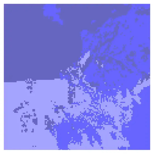 Förstora bildenFigur 2: Ett exempel på tre radaranläggningars bidrag i ett utsnitt av en komposit. Varje datapunkt i detta fall motsvarar en ruta omkring 2x2 kilometer i verkligheten.