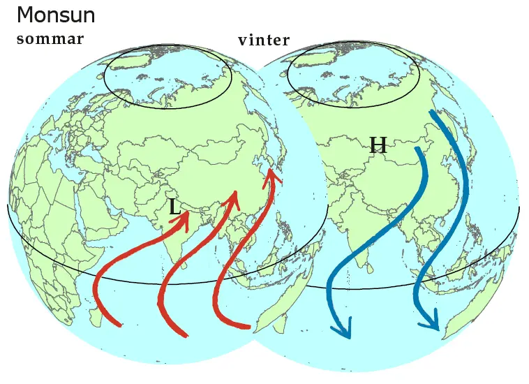 Förstora bildenMonsunvindarnas rörelser vid olika årstider.