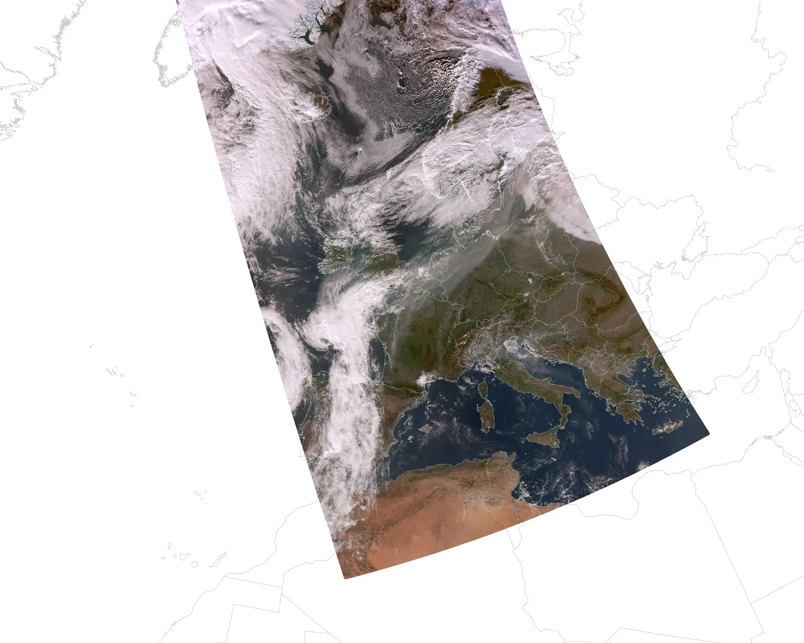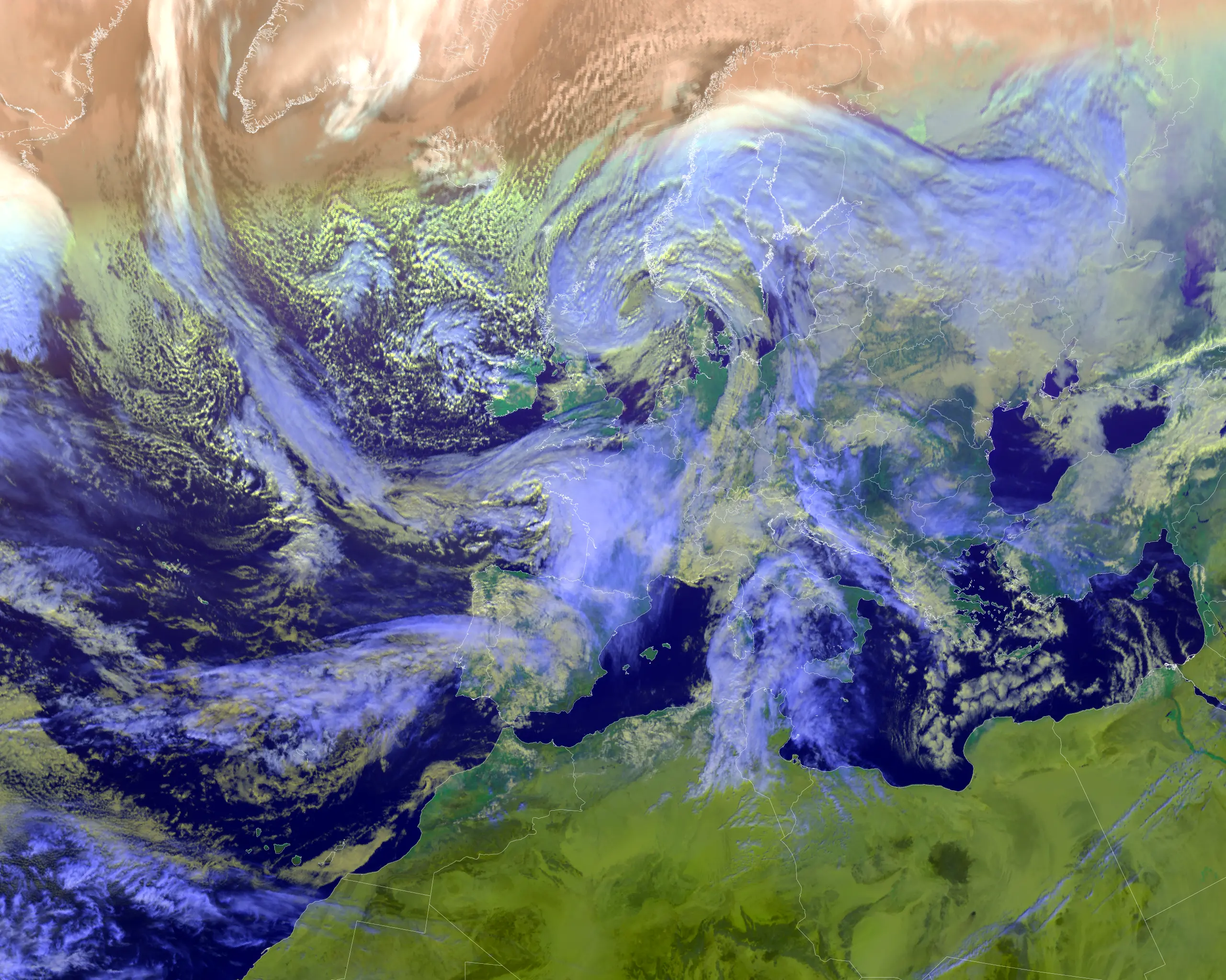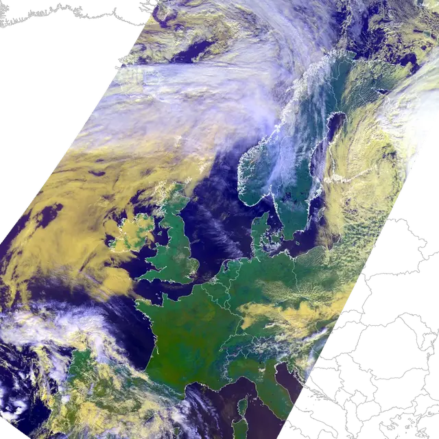 Förstora bildenSatellitbild sammanställd av de tillgängliga kanaler som finns hos de satelliter som SMHI använder.