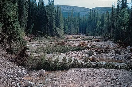 Åar och bäckar och till och med normalt torra sänkor blev så överfulla av forsande vatten, att erosionen underminerade tusentals träd och satte stora stenblock i rörelse.