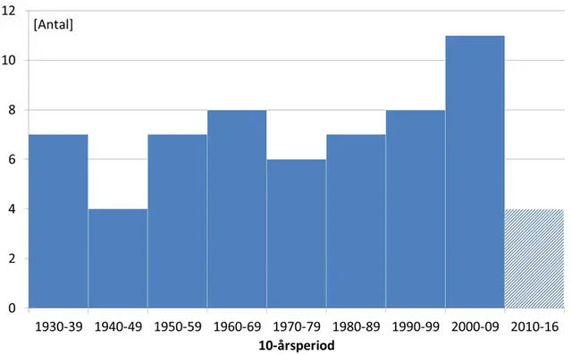 Varje stapel i diagrammet visar antalet fall per tioårsperiod sedan 1930 i Sverige med minst 90 mm nederbörd över 1000 km² under 24-timmar.