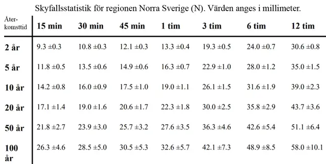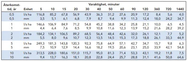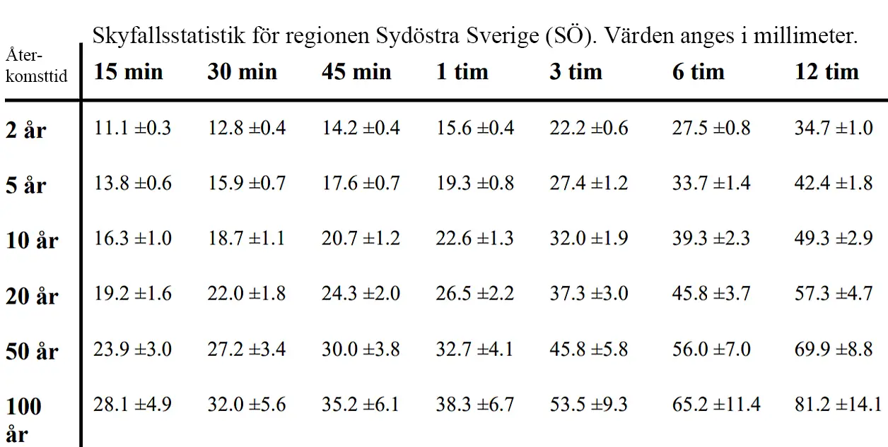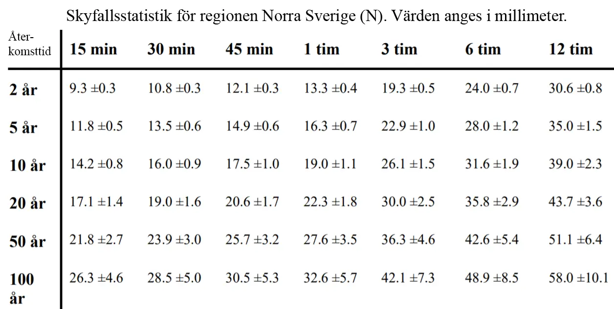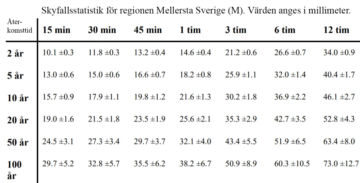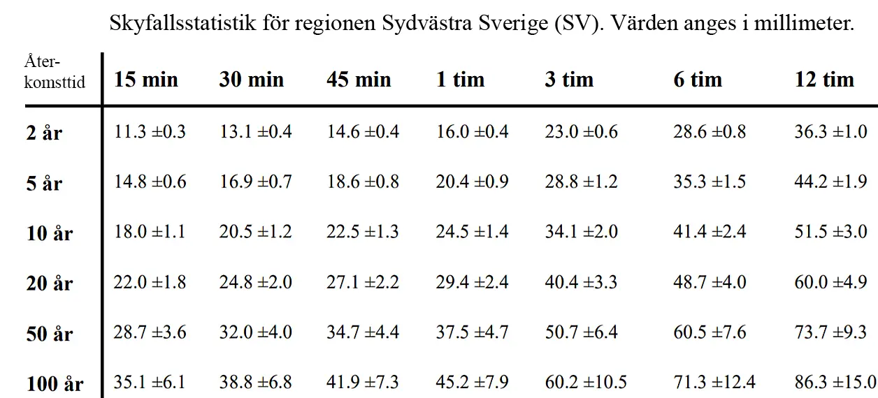 Den rekommenderade regnstatistiken är hämtad från rapporten ”Regnintensitet – En molnfysikalisk betraktelse” (Dahlström, 2010). I Bilaga C i rapporten finns nedanstående tabell. Enligt rapporten kan denna tabell användas för hela Sverige. Vid dimensionering av till exempel rör för dränering och liknande rekommenderas kommuner, konsulter och andra att använda denna tabell.