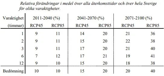 SMHI sammanfattar därför de relativa förändringarna i en tabell som bygger på data för hela Sverige och återkomsttiderna 5, 10, 50 och 100 år (se tabell 3 nedan). Generellt kan man säga att ökningen av de extrema regnen ligger på cirka 10–20 procent fram till mitten av århundradet oberoende av utsläppsscenario. Därefter ligger det lägre utsläppsscenariet (RCP45) kvar kring 20 procents ökning, medan det högre utsläppsscenariet (RCP85) går mot cirka 40 procents ökning. Dessa värden återfinns längst ned i tabellen som bedömda förändringar för samtliga varaktigheter och återkomsttider i hela landet.