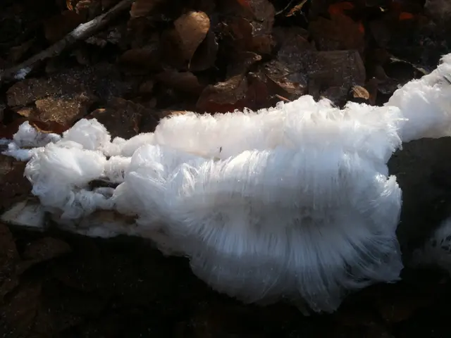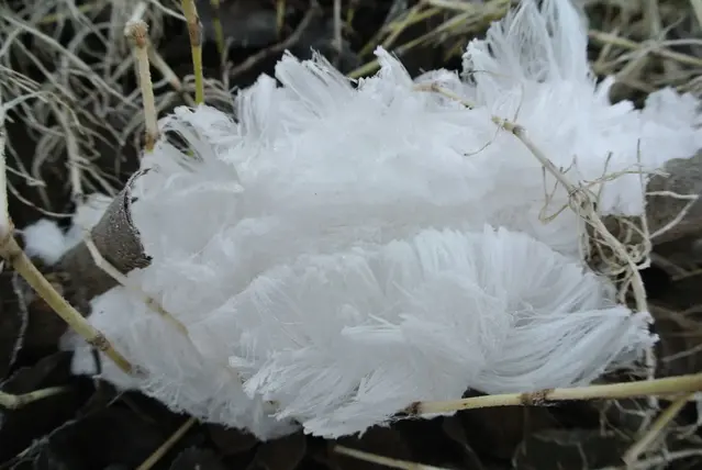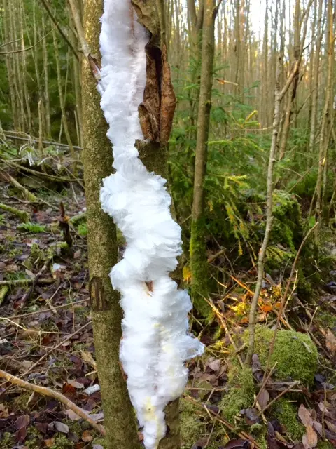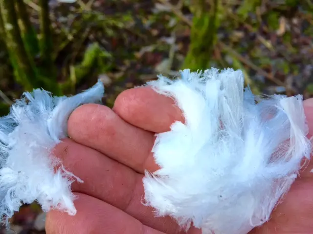 Men vid närmare inspektion visade det sig vara långa frusna trådar av vatten som satt ihop i sjok på grenar som låg på marken.