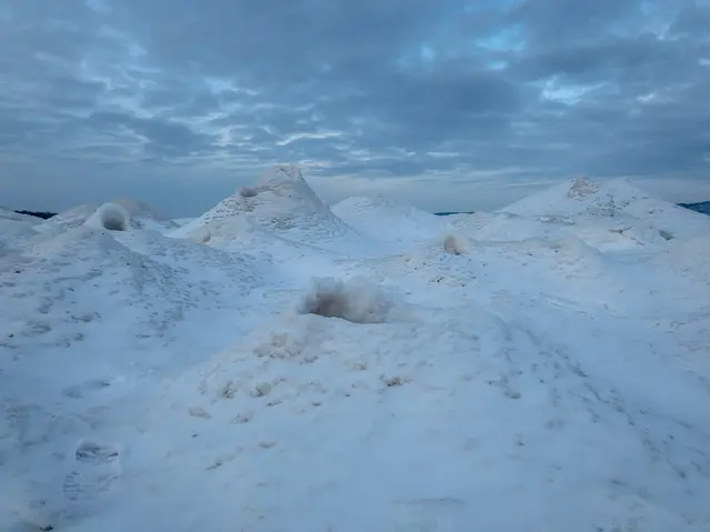 Isvulkaner vid Kivik 5 mars 2018. En snövit till vänster och en lite mer sandbemängd till höger.