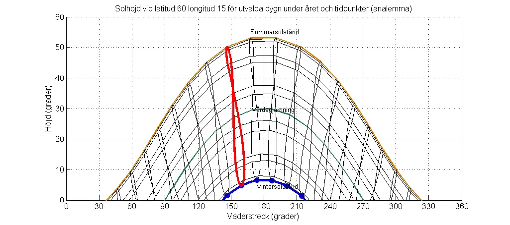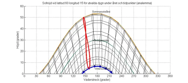 Förstora bildenEtt solbanediagram visar solens höjd över horisonten och i vilket väderstreck den står för olika klockslag (mittpunkten av timmen) under året. För klockan 10.30 svensk normaltid bildas en kurva kallad analemma, som är markerad i rött. Solens bana vid sommarsolståndet är markerat i orange, vid vintersolståndet i blått och vid vår- och höstdagjämningarna i grönt.