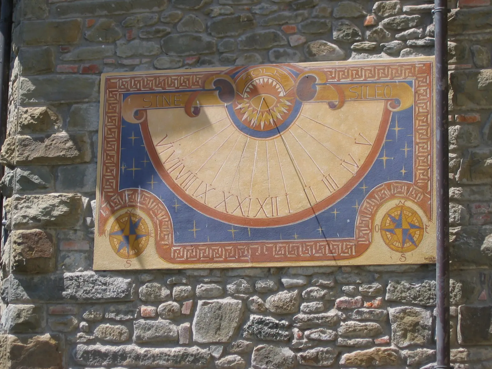 Förstora bildenBilden på soluret i Toscana är tagen den 6 juli kl 15:08 sommartid. Vad motsvarar detta uttryckt i sann soltid? Korrektion för sommartid ger kl. 14:08 medelsoltid för 15 grader ost. Toscana ligger omkring tre grader väster om denna tidsmeridian alltså ska cirka 12 min dras bort. Denna dag är tidsekvationen -5 minuter. För att räkna om medelsoltiden till sann soltid drar vi därför bort 17 (12+5) minuter vilket ger den sanna soltiden 13:51. Soluret på bilden är graderat med romerska siffror och skuggan ligger strax före II, dvs kl 14. Soluret förefaller vara korrekt. Devisen överst på soluret: "Sine Sole Sileo" motsvarar ungefär "fungerar ej utan solen".