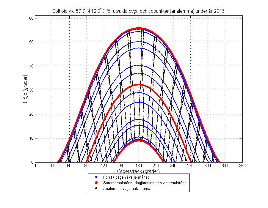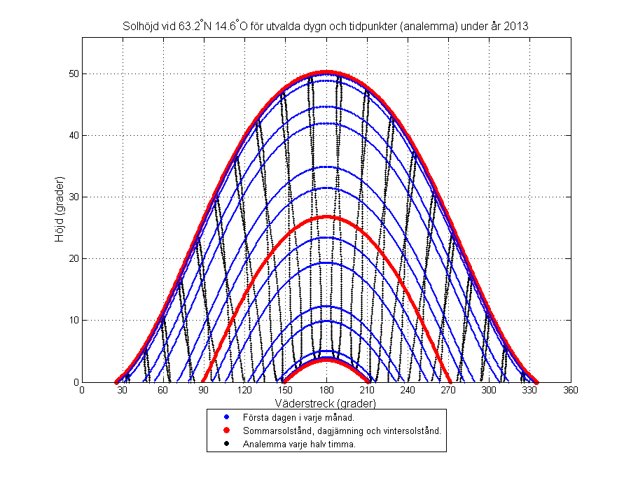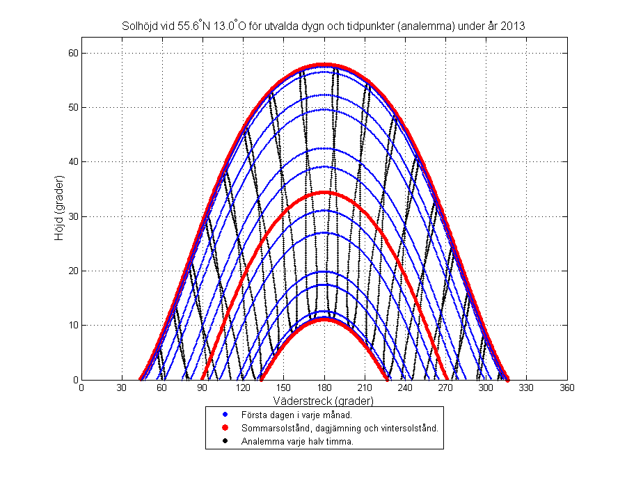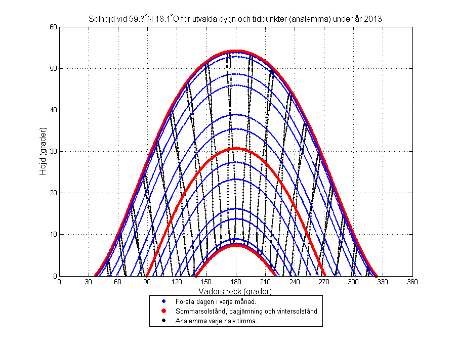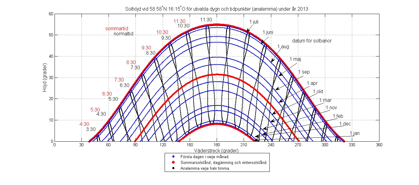 Att solen står högre på himlen under sommaren än på vintern för ett givet klockslag är självklart. Men att även väderstrecket varierar något är inte lika givet. Detta åskådliggörs i ett solbanediagram med något som liknar en utdragen åtta, ett så kallat analemma. Ett analemma visar solens position på himlen för ett givet klockslag varje dag under ett år.
