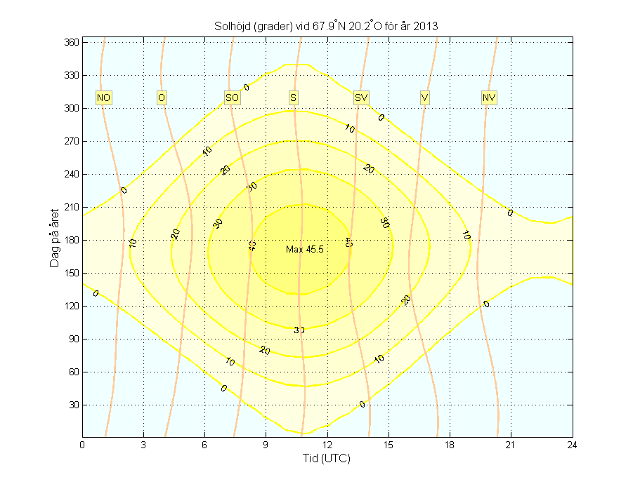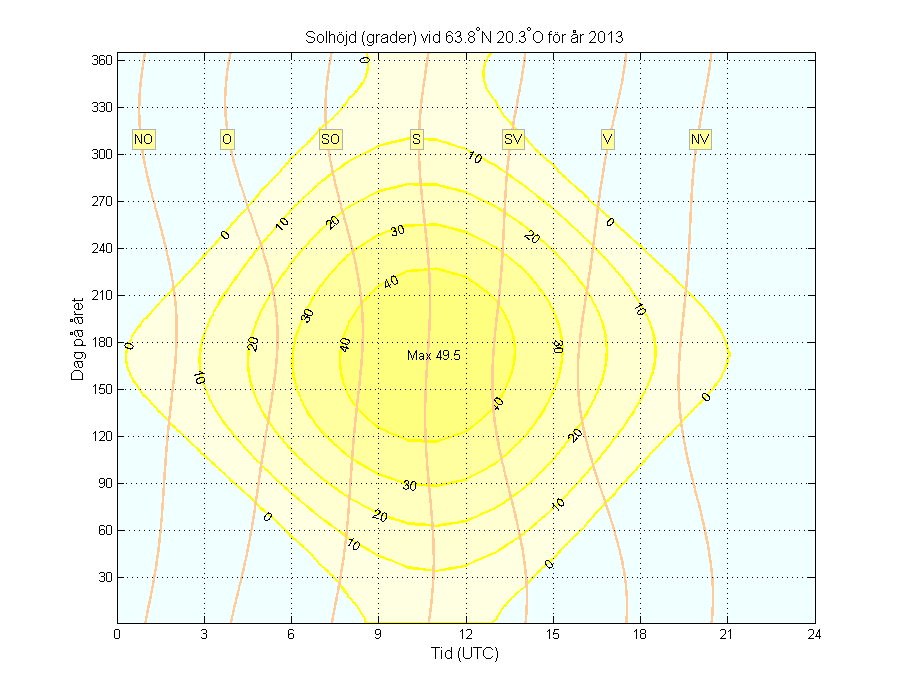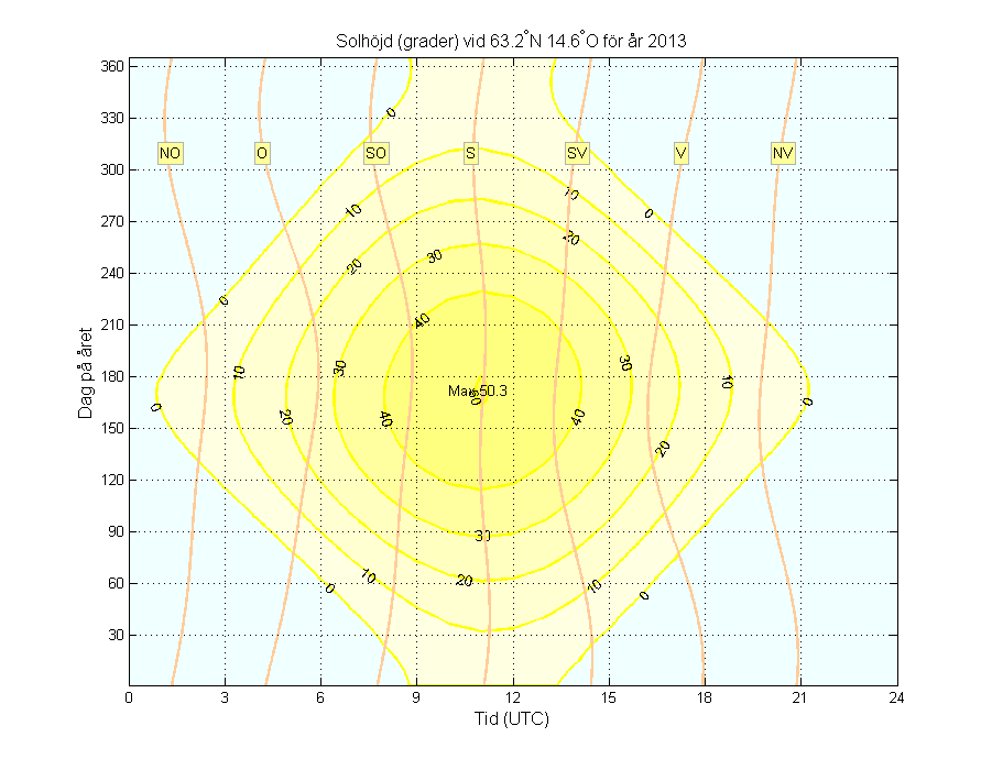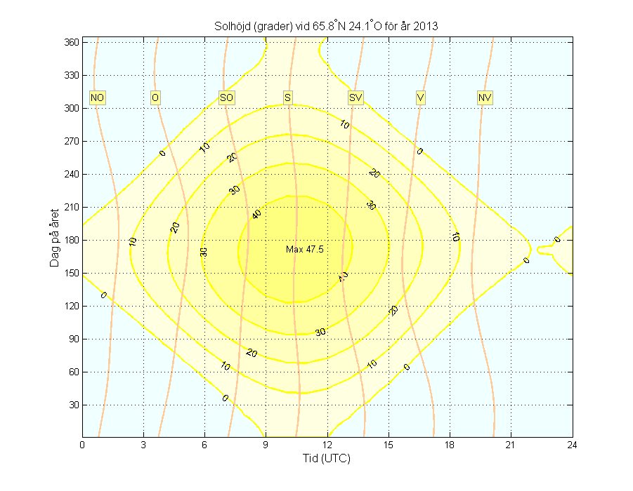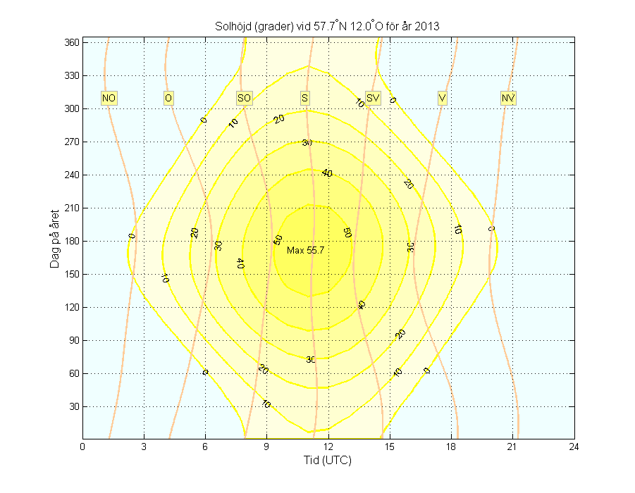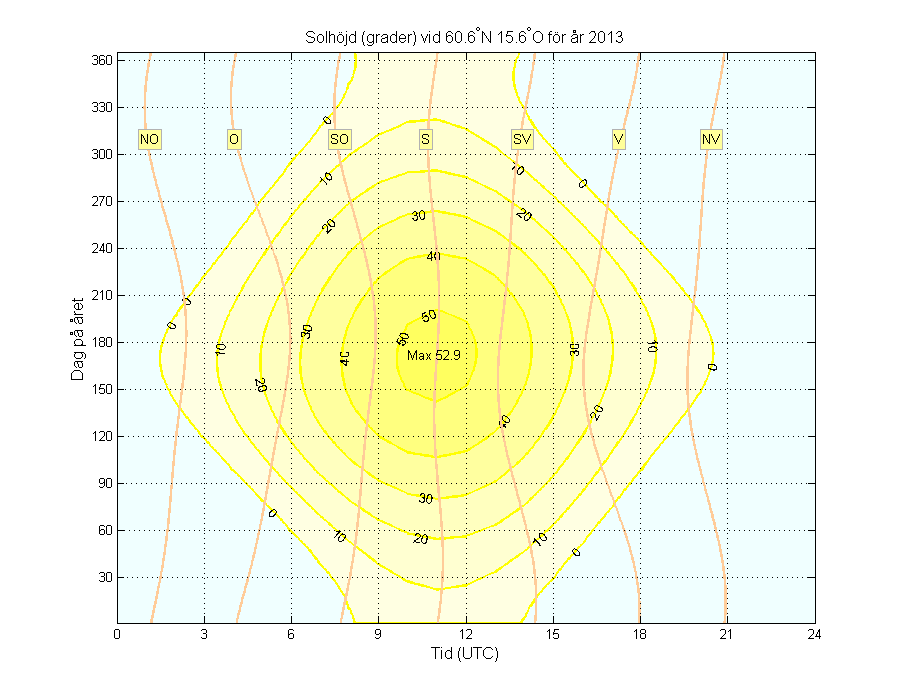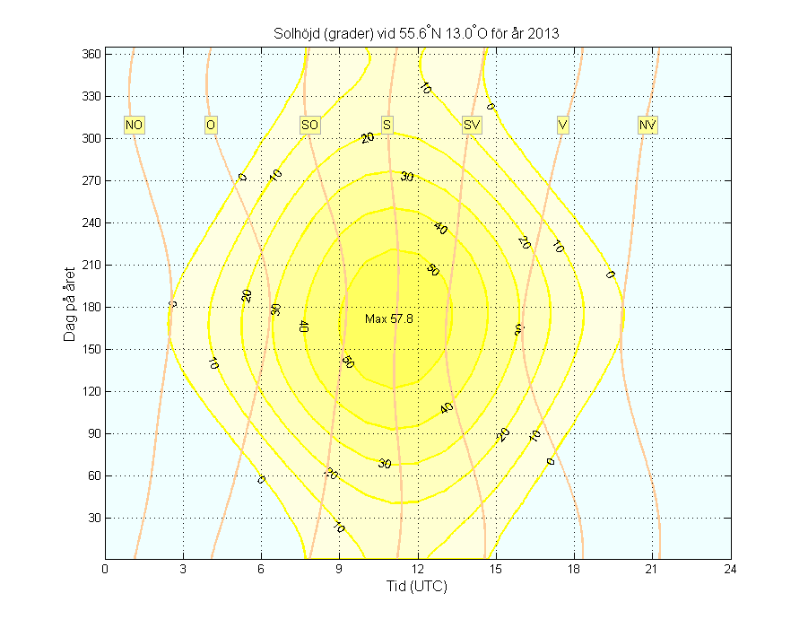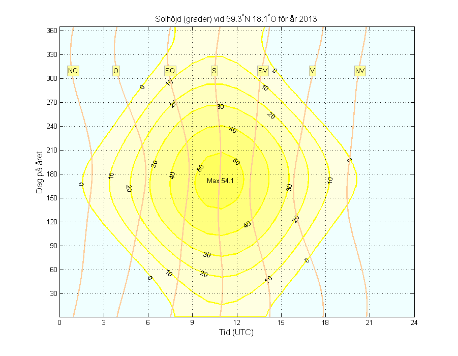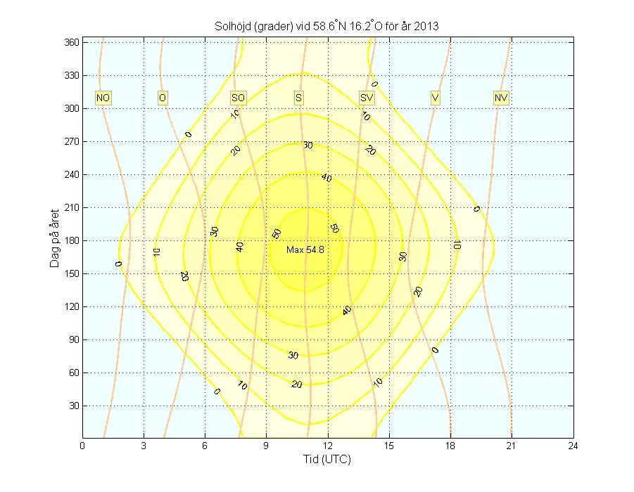 Förstora bildenSolbanediagram för Norrköping (58,6˚N 16,2˚O) där solhöjden visas som konturer, dag på året visas på y-axeln, tid (UTC) visas på x-axeln och väderstrecken är de något böjda orangea linjerna.