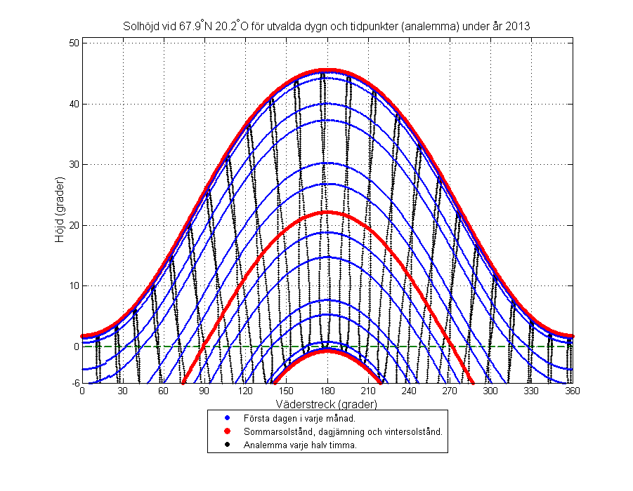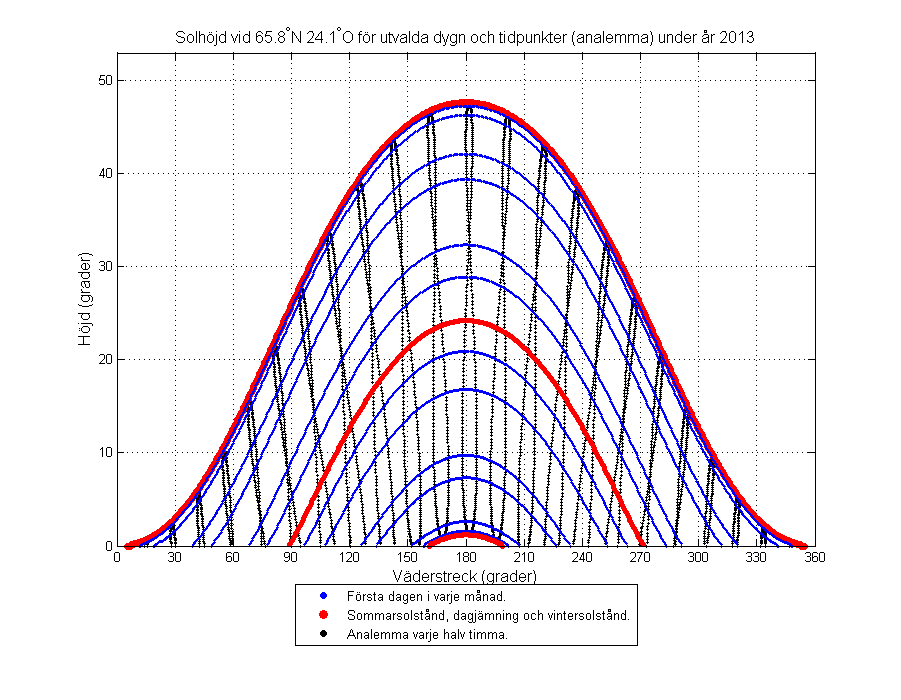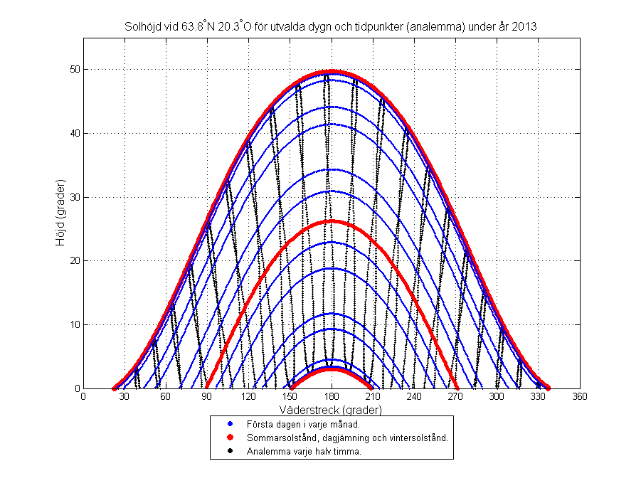 I figuren ovan kan vi nu se att vid sommarsolståndet i Norrköping (d.v.s. när solen är uppe som längst), går solen upp vid omkring 02:00, når sitt maximum vid omkring 10:30 och går ner omkring 20:00 (alla tider i UTC). Svensk normaltid är UTC + 1 timme och vid sommartid + 2 timmar.