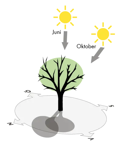 Förstora bildenHur solljuset faller beror på plats, tid på året och tid på dygnet. I mitten av oktober står solen ungefär i sydost klockan åtta på morgonen i Stockholm, men den står högre och mer åt öster vid samma klockslag i slutet av juni.