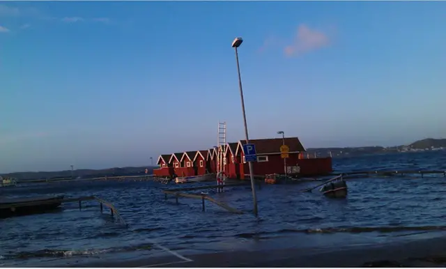 Bild från Ellös på västra Orust den 10 januari 2015, där vattenståndet vid tillfället var cirka 130 cm över medelvattenstånd.