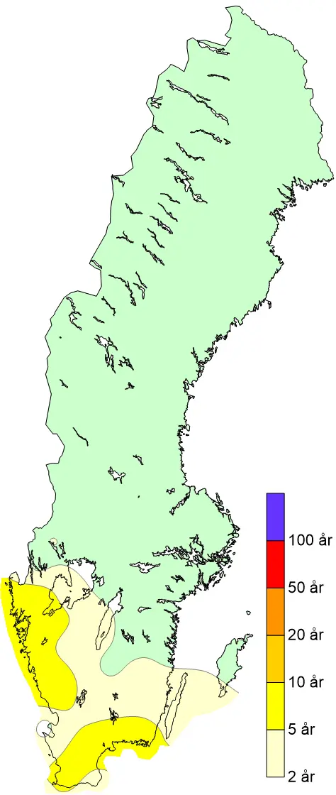 Förstora bildenBeräknad återkomsttid för de byvindhastigheter som förekom under stormen den första advent 2011.