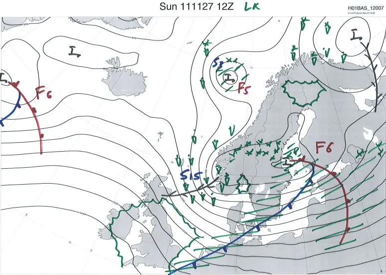 Förstora bildenSMHIs analys av väderläget klockan 13 den 27 november 2011.