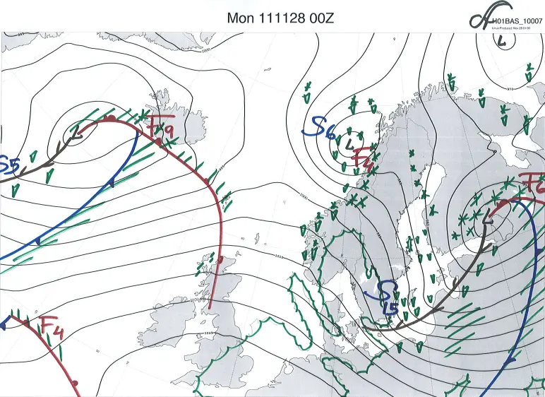 Mellan Skottland och Sydnorge syns en så kallad tråglinje på kartan klockan 13. Det är ett kallfrontsliknande fenomen som ofta följer bakom den egentliga kallfronten.