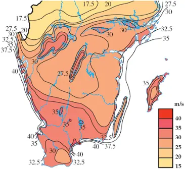 Förstora bildenKartan visar en översiktlig analys av maximala byvindar på 10 meters höjd, i tämligen öppen terräng och för vindmätare typisk placering, den 8-9 januari 2005. Det bör understrykas att vindbyar på 30 m/s som förekommit i det skogrika inlandet genom södra/mellersta Götaland i allmänhet ställer till med betydligt mer förödelse än byar på 35 m/s i kustregionen, där vegetationen är mycket tåligare. De få mätningarna från 1969 antyder att det även då förekom byar på över 30 m/s i inlandet, den gången dock främst i norra Götaland.