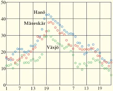 Förstora bildenVindbymaximum (m/s) per timme, den 8-9 januari 2005. Vi kan se att stormen rasade som värst, t ex i Växjö, kl 18-23.