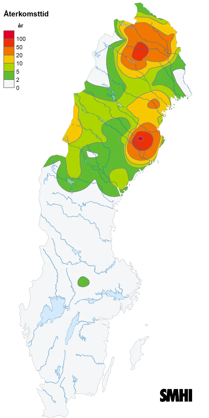 Av övriga stationer i rekordtabellen hade Saittarova och Rensjön en beräknad återkomsttid på 45 år och Älvsbyn 27 år.