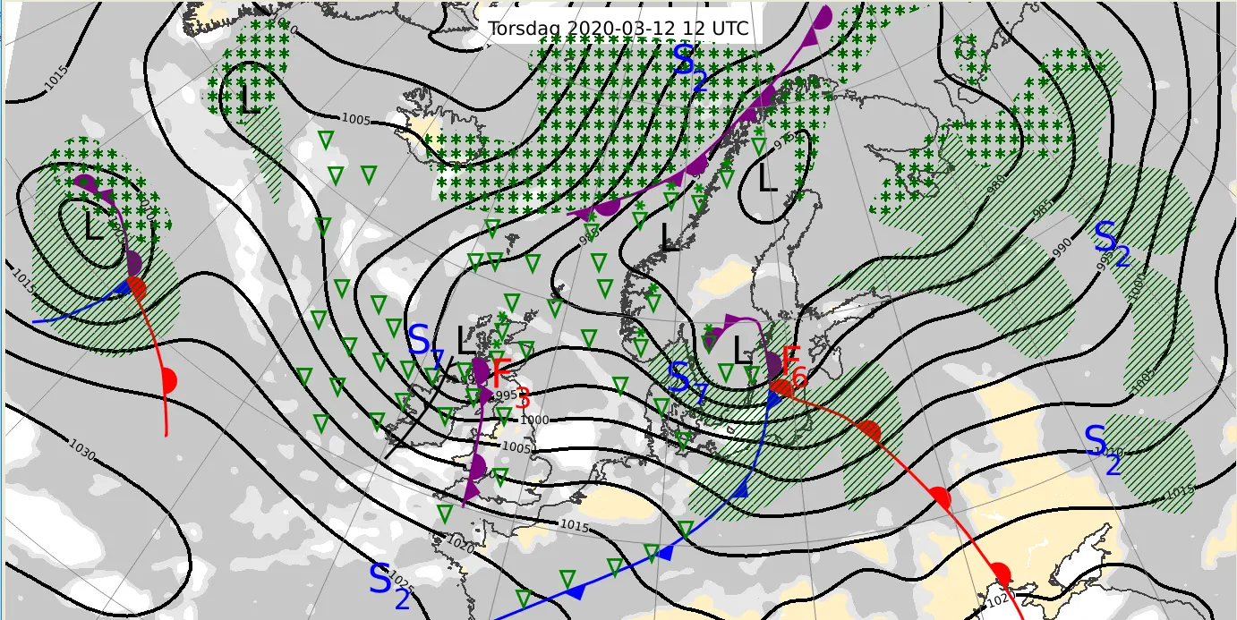 Förstora bildenVäderläget klockan 13 den 12 mars 2020.