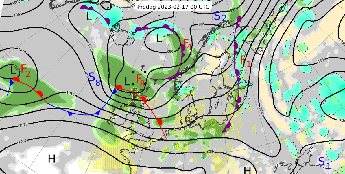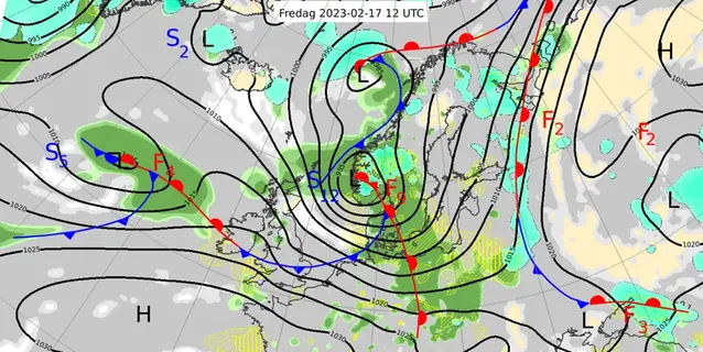Förstora bildenAnalys av väderläget klockan 13 den 17 februari 2023.