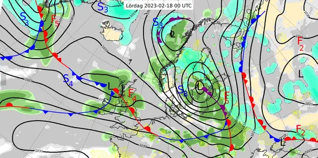 Förstora bildenAnalys av väderläget klockan 01 den 18 februari 2023.