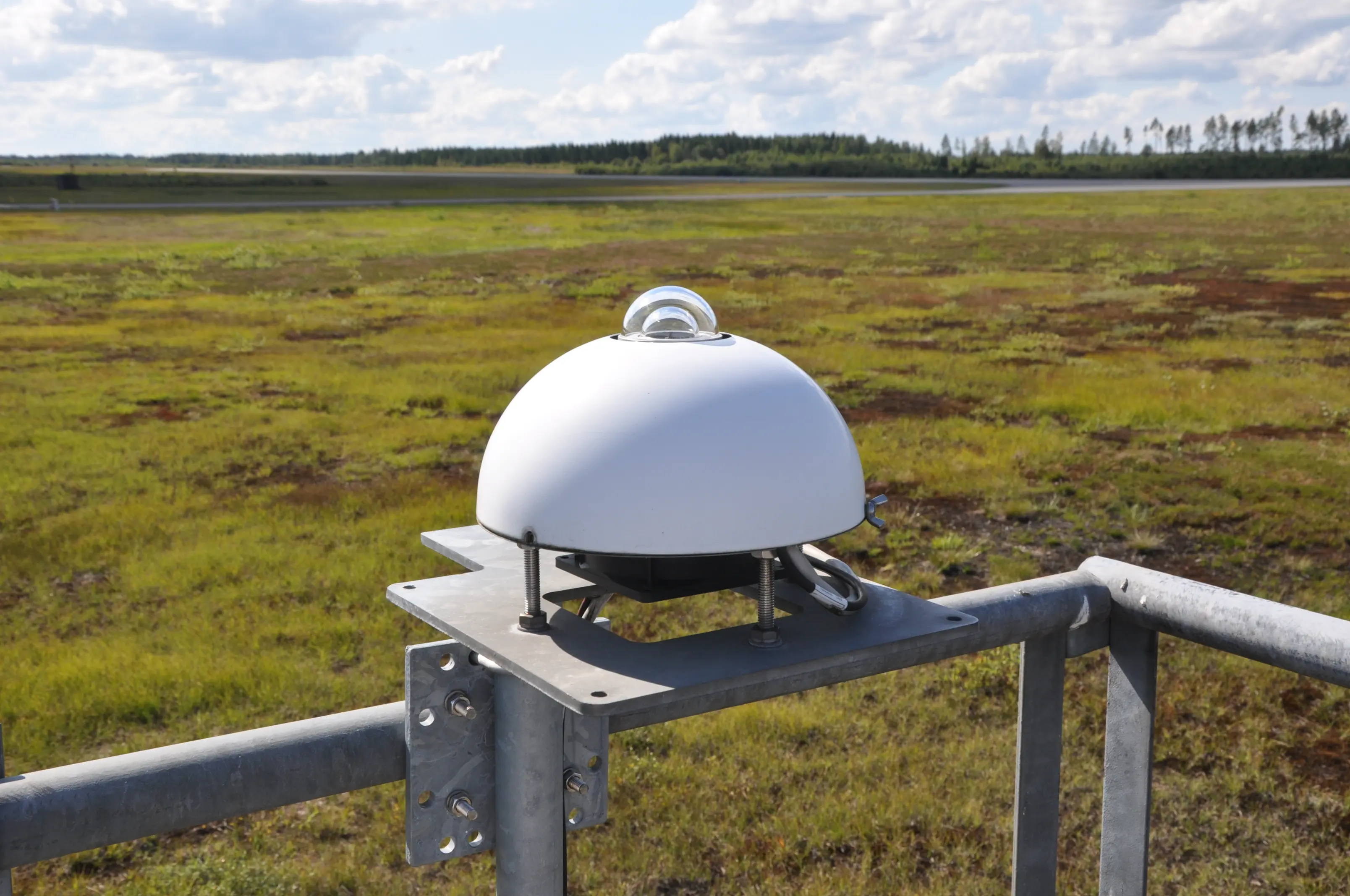 Förstora bildenPyranometer för mätning av globalstrålning, modell Kipp & Zonen CM-21, försedd med en vit ventilationshuv som ser till att hålla rimfrost och dagg borta