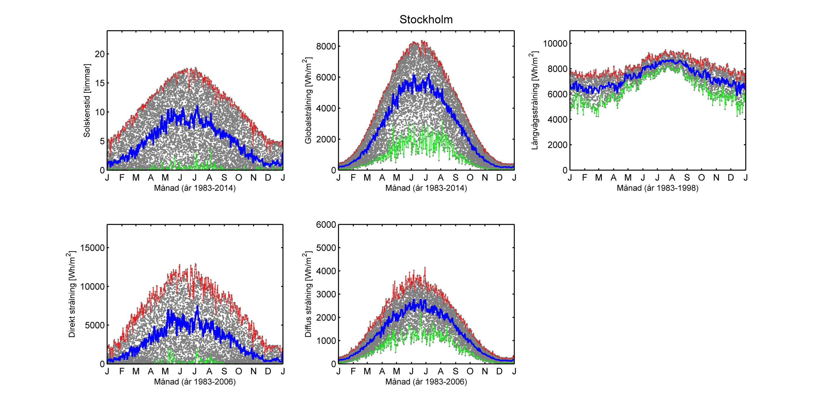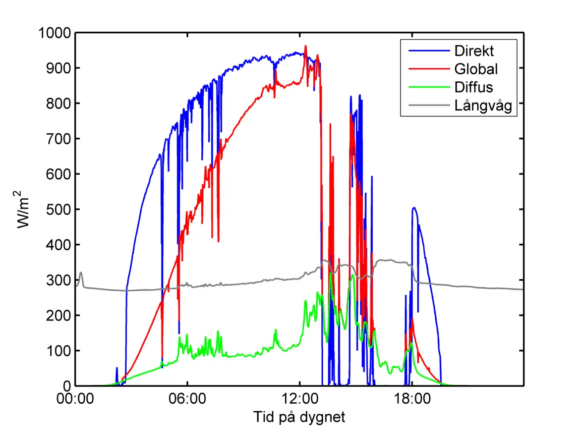 Det finns ett flertal olika parametrar för att beskriva solinstrålningen till jordytan. Vid samtliga av SMHIs mätstationer mäts infallande solstrålning mot en horisontell yta från alla riktningar, så kallad globalstrålning. Variationen av globalstrålningen under en dag i maj från mätstationen i Norrköping visas i Figur 1 (röd linje). Vädret var mestadels soligt under förmiddagen med passerande mestadels tunna moln, men mer molnigt under eftermiddagen. Tvära dippar i globalstrålningen ses när moln passerar mätstationen. Under en molnfri sommardag uppnår globalstrålningen som mest cirka 900 W/m2.