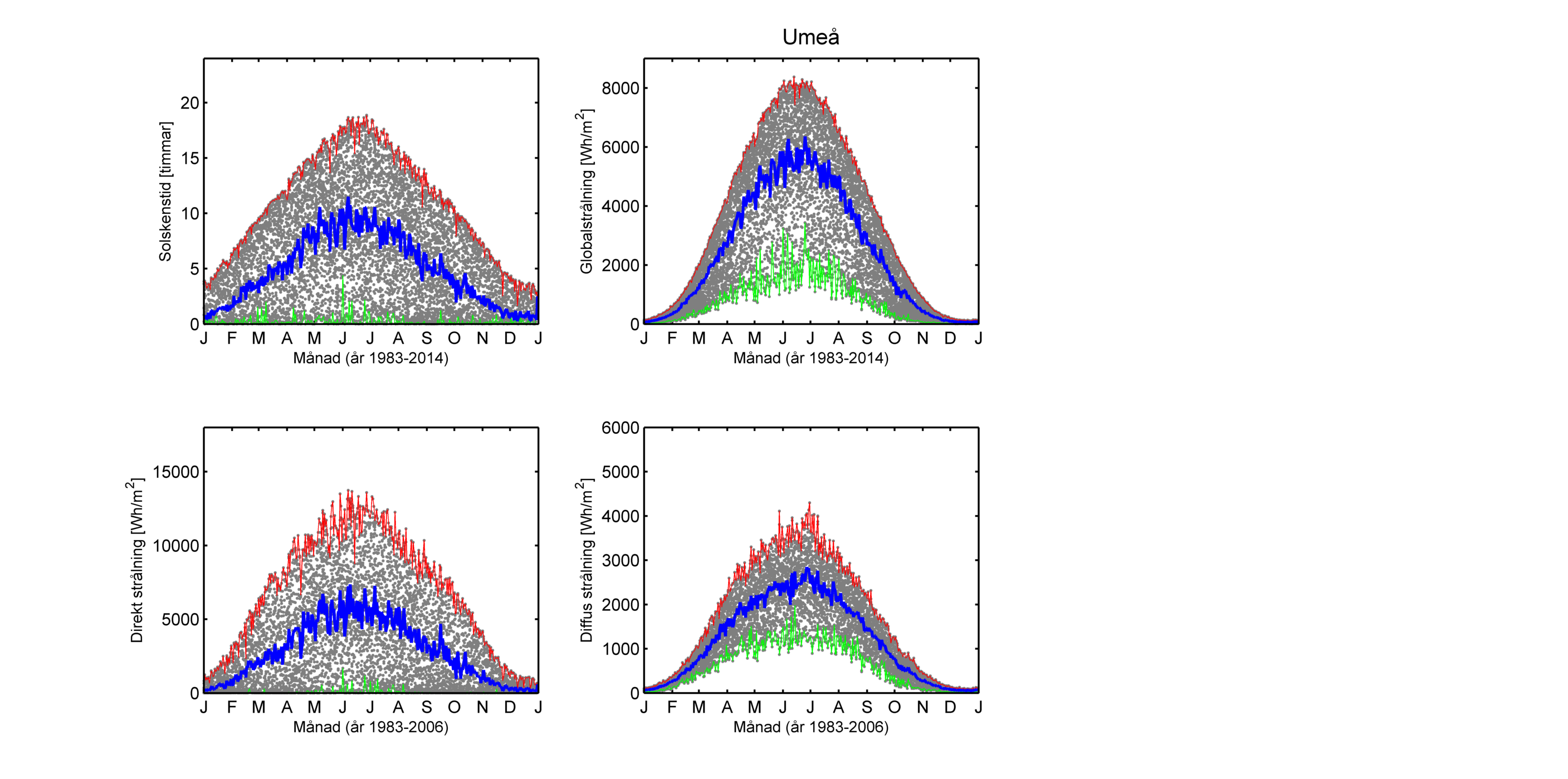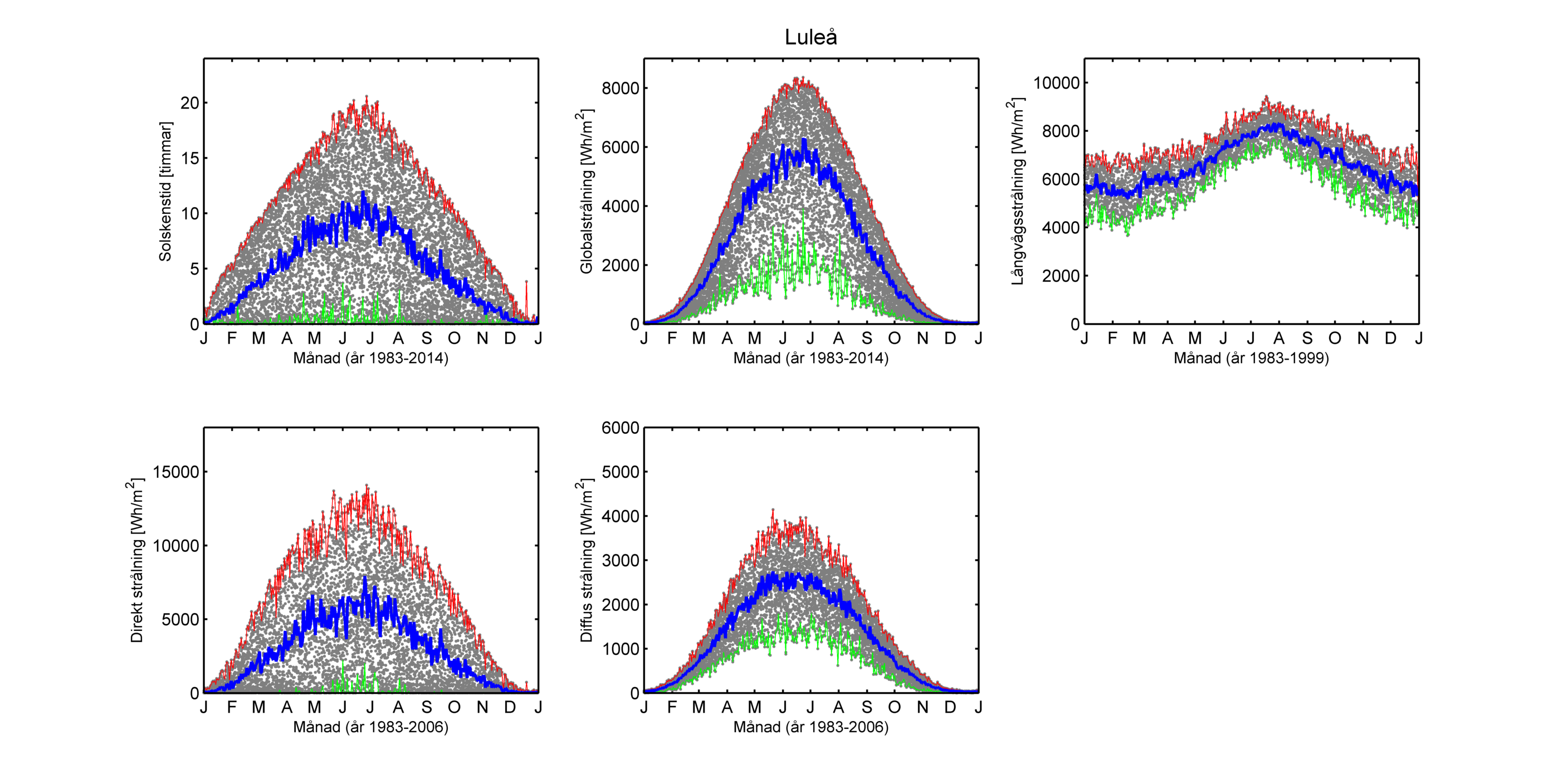 I Figur 3 syns den genomsnittliga årsvariationen av strålning baserad på dygnsvärden. Den styrs främst av antalet timmar som solen befinner sig över horisonten och hur högt solen når på himlen.