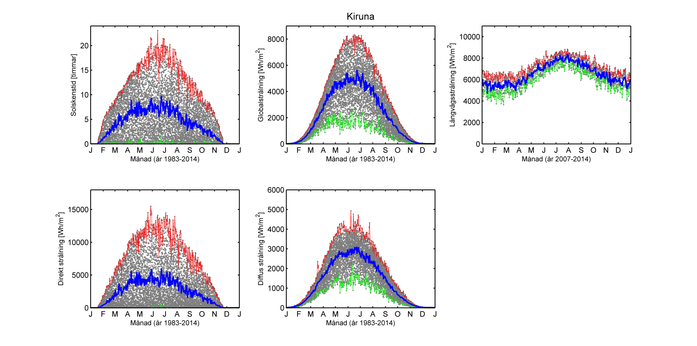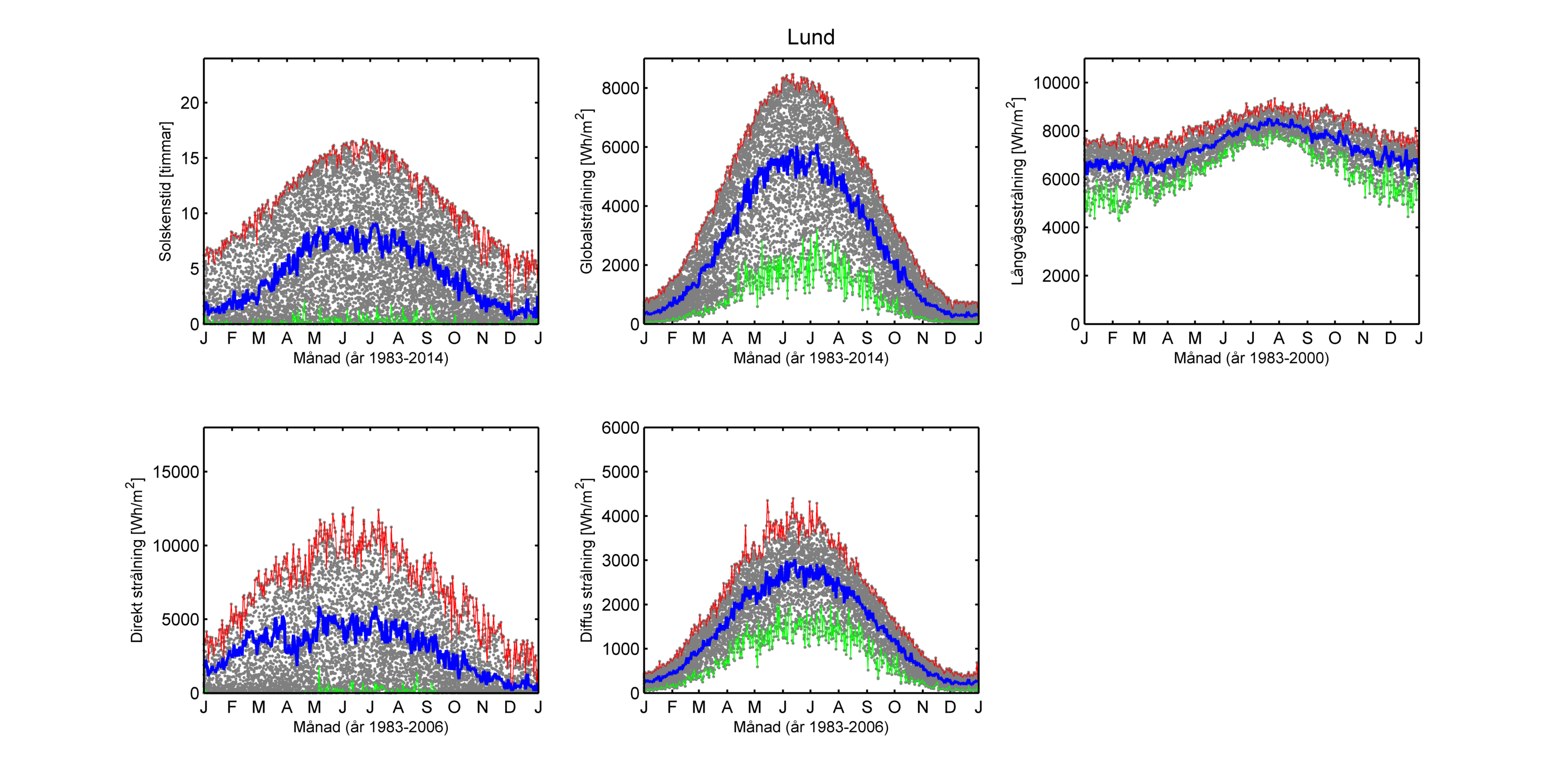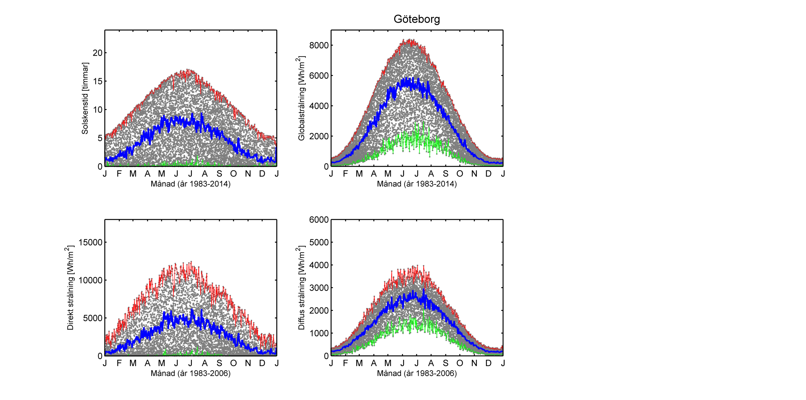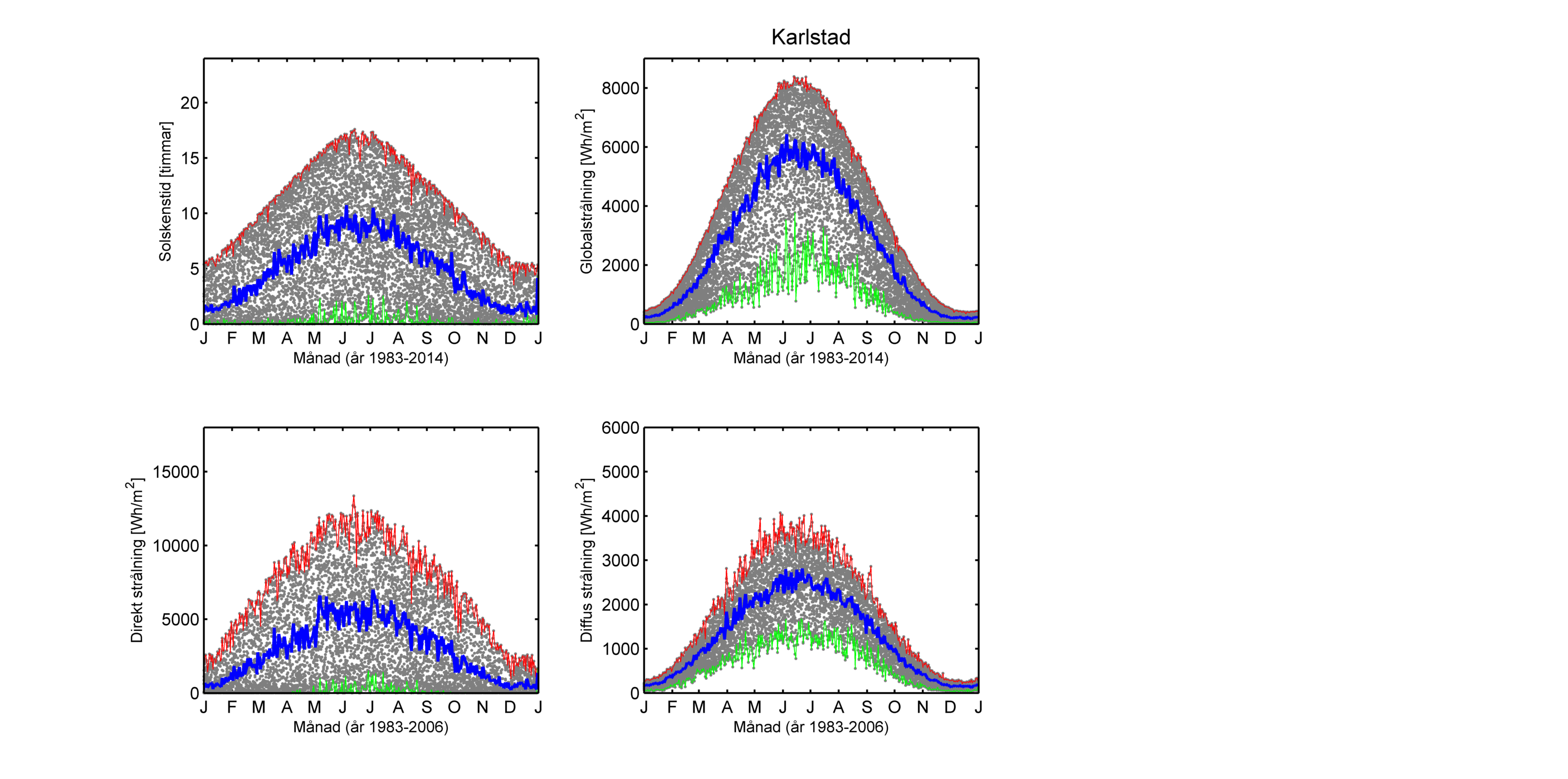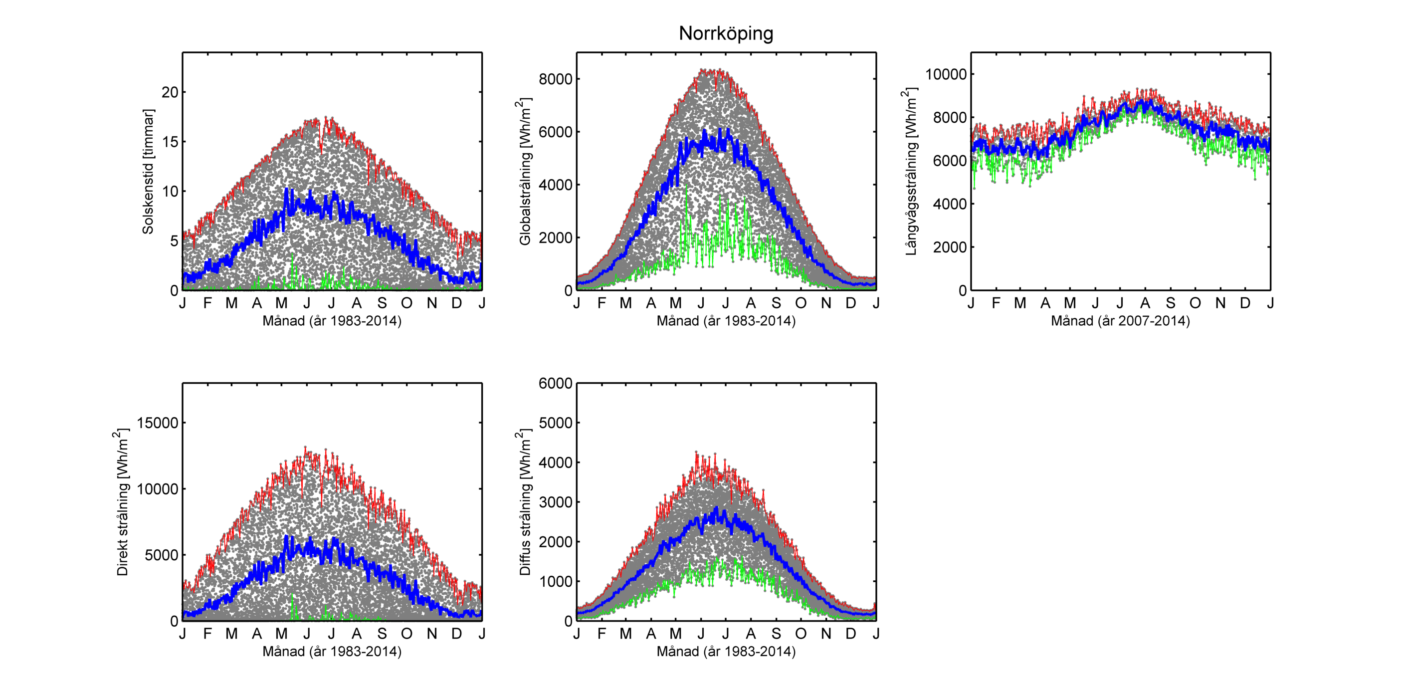 Förstora bildenFigur 3. Årstidsvariation av solstrålning uppmätt i Norrköping 1983-2014. Grå punkter visar dygnsvärden (ackumulerade) för samtliga dagar under perioden, blå kurva visar medelvärden för varje dag på året över samtliga år, röd och grön kurva visar max respektive min värden för varje dag på året över samtliga år.