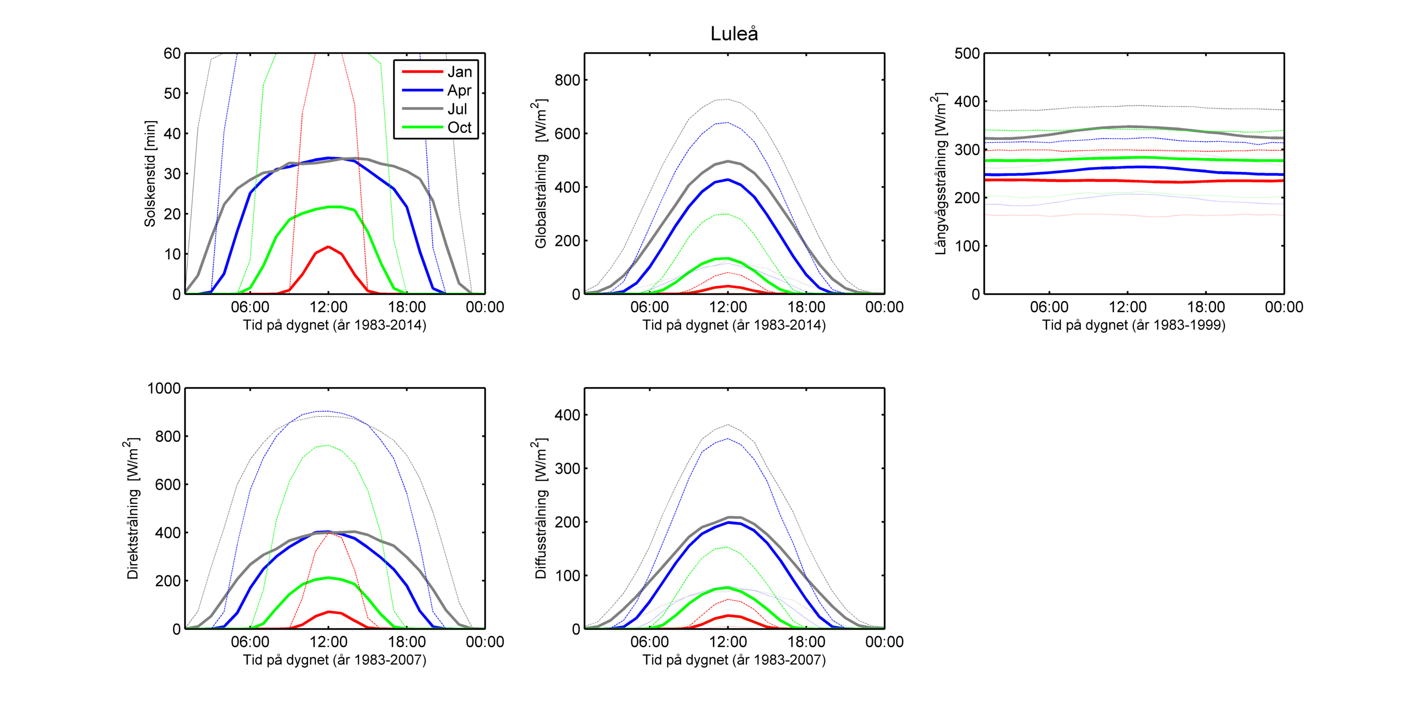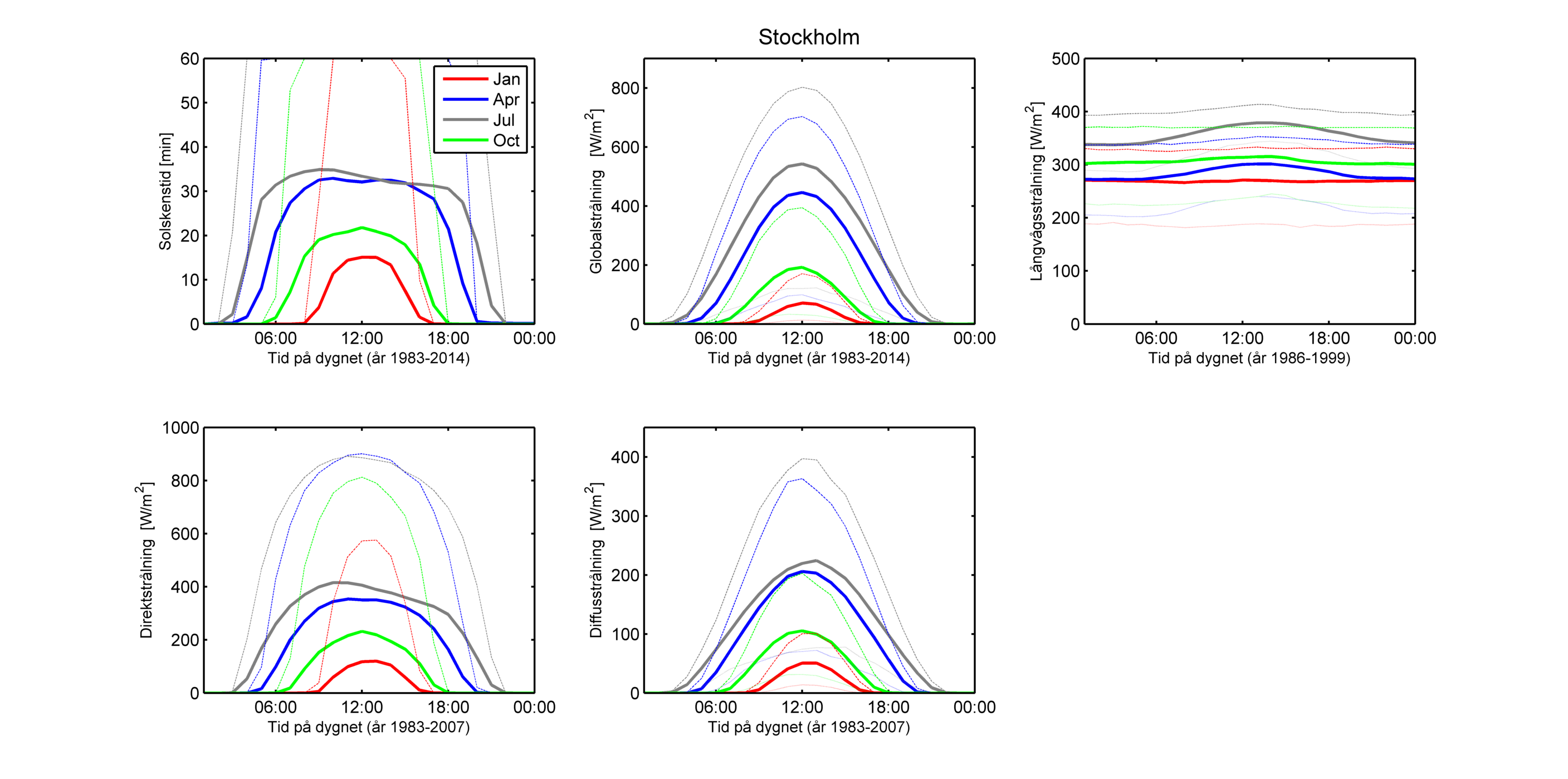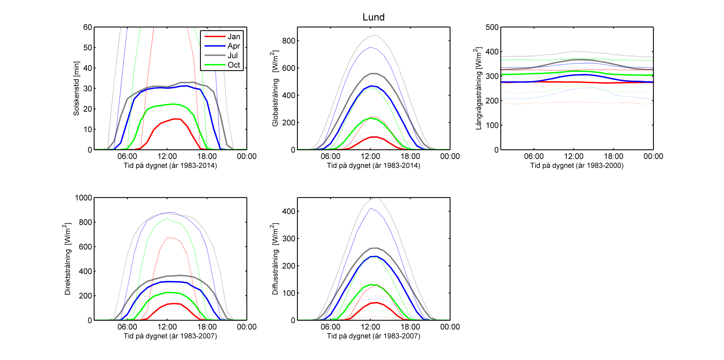 Den genomsnittliga dygnsvariationen för samtliga strålningsparametrar från mätningarna i Norrköping sedan dess start (som längst 1983) visas i Figur 2. Här är effekten av moln utslätad genom medelvärdesbildning över åren och kurvorna blir mjuka och speglar solens upp och nergång. Långvågsstrålningen har till skillnad från övriga strålningsparametrar endast en svag dygnsvariation.