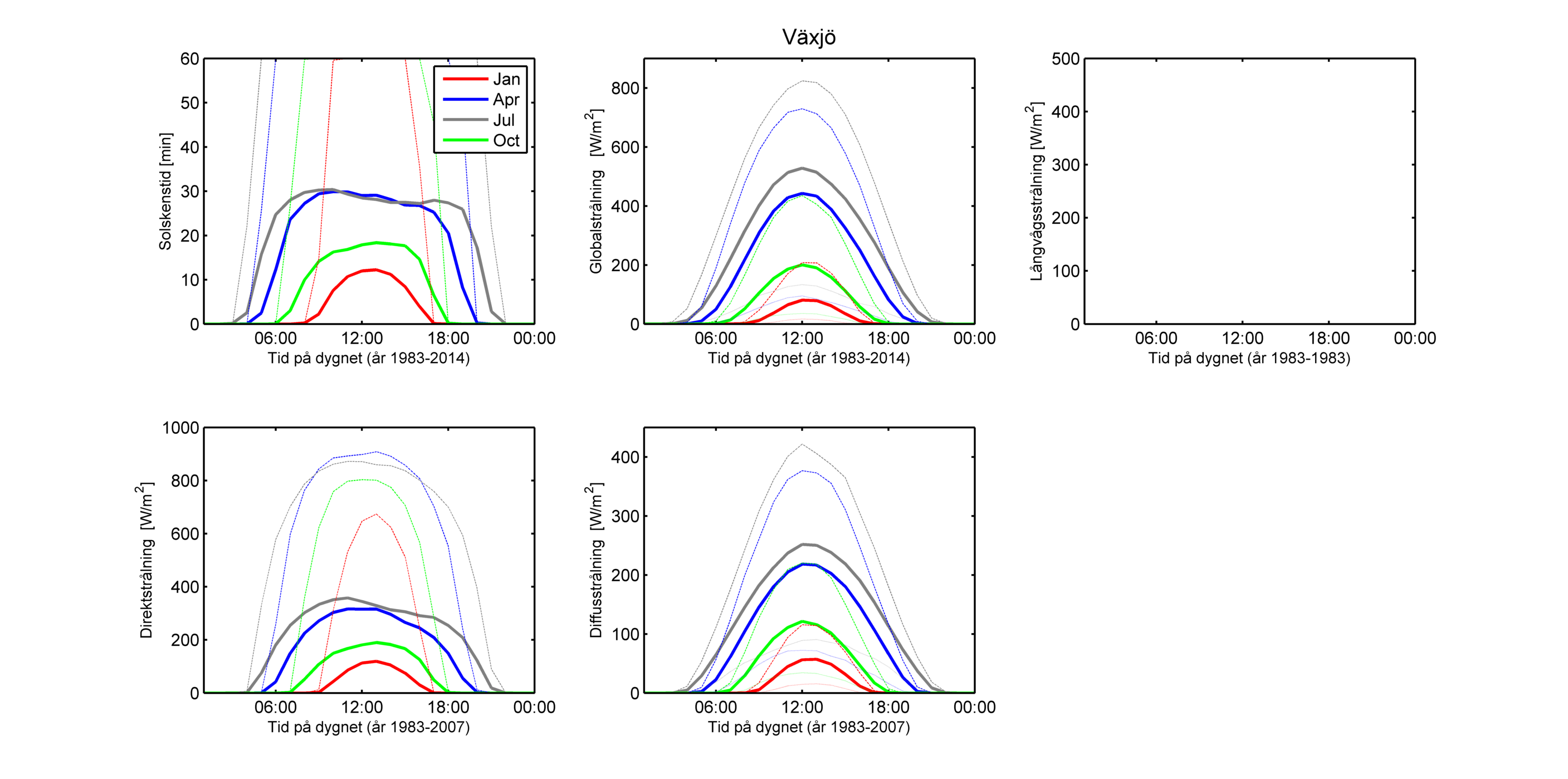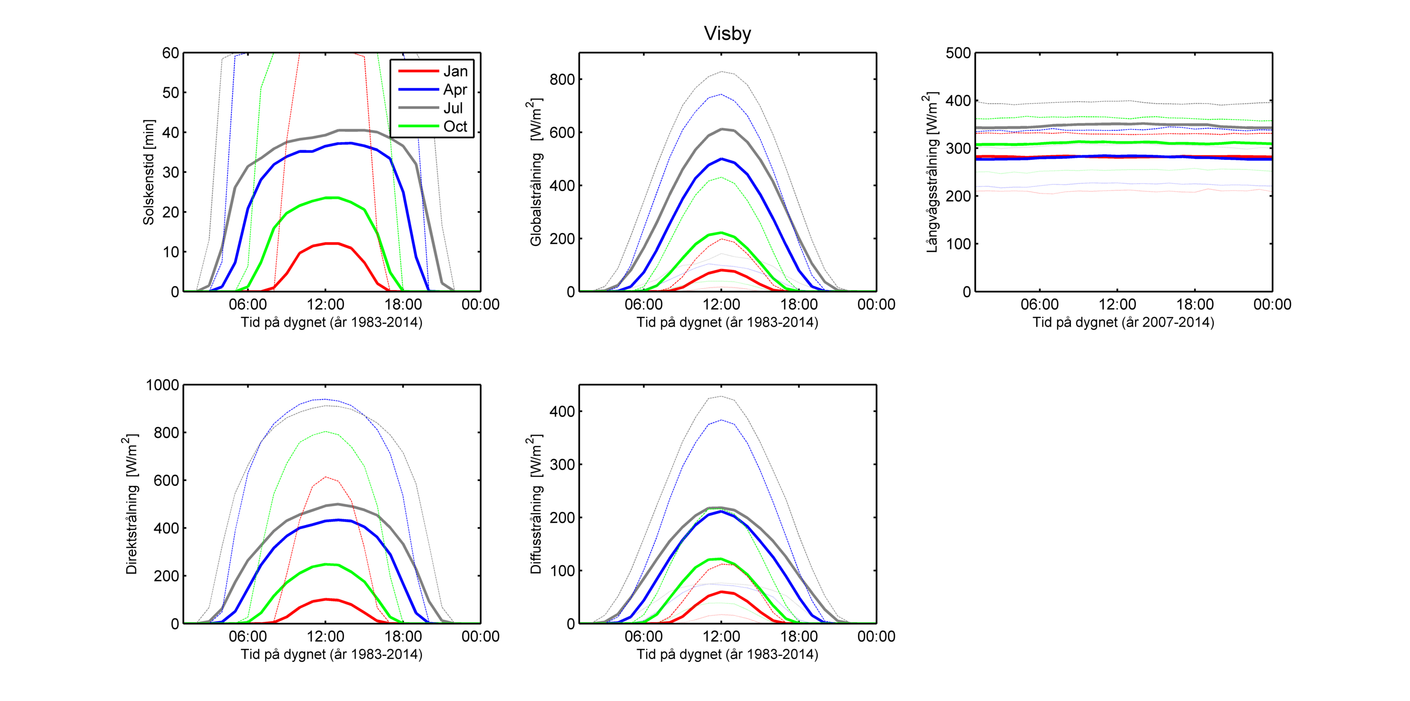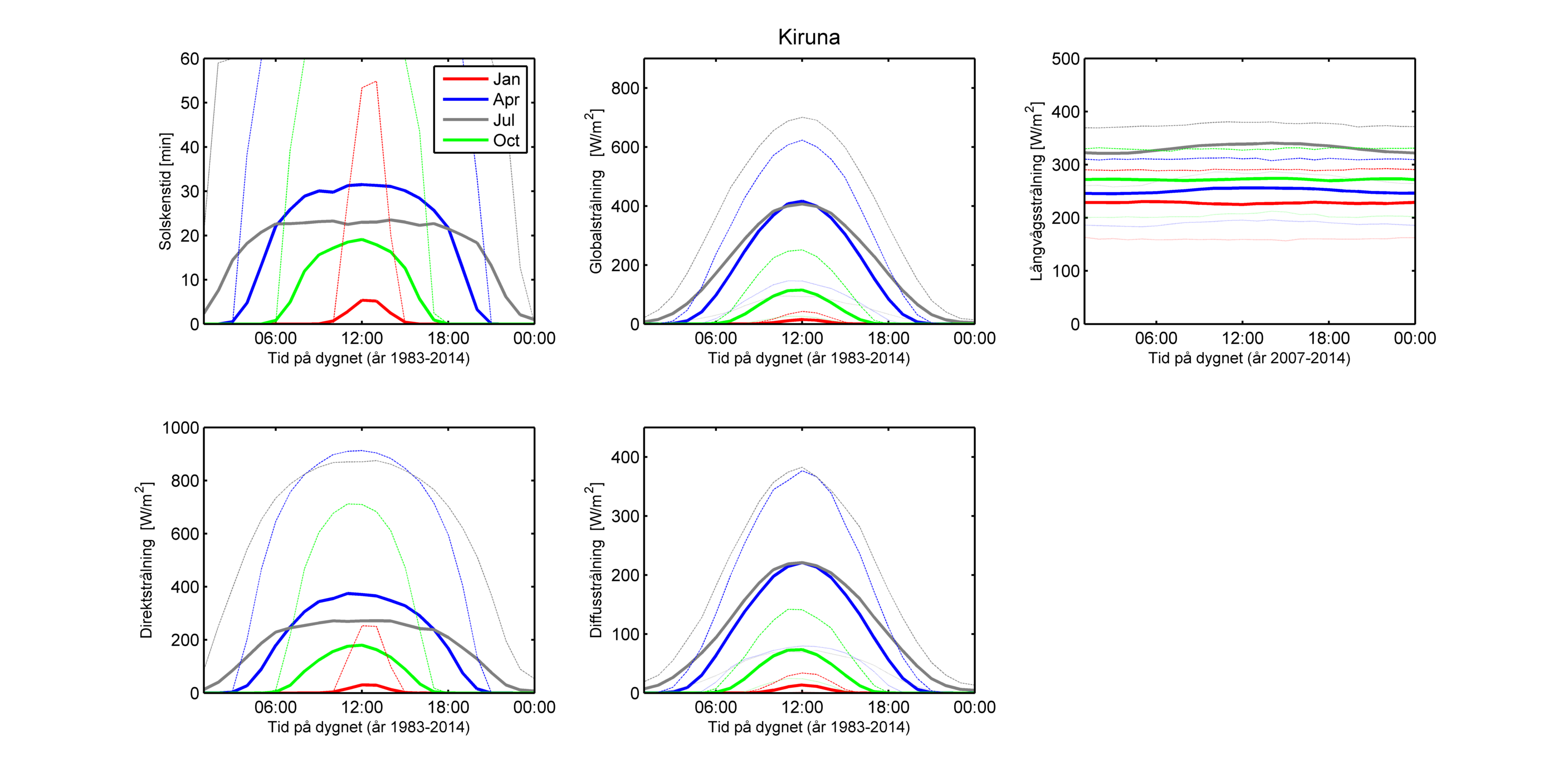 Den genomsnittliga dygnsvariationen för samtliga strålningsparametrar från mätningarna i Norrköping sedan dess start (som längst 1983) visas i Figur 2. Här är effekten av moln utslätad genom medelvärdesbildning över åren och kurvorna blir mjuka och speglar solens upp och nergång. Långvågsstrålningen har till skillnad från övriga strålningsparametrar endast en svag dygnsvariation.