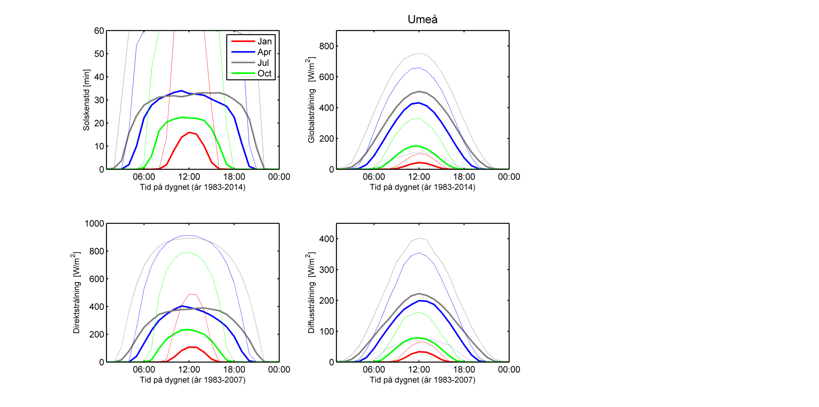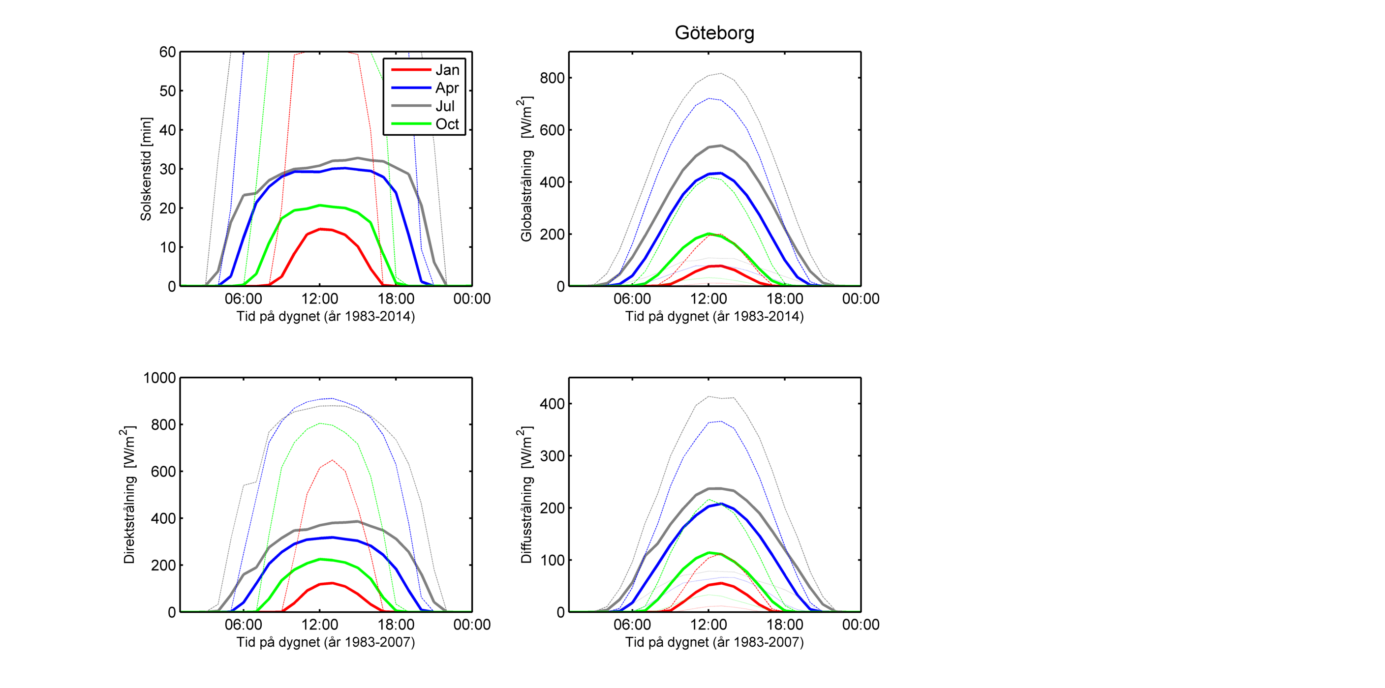 Förstora bildenFigur 2. Dygnsvariation av solstrålning uppmätt i Norrköping 1983-2014. Heldragna linjer visar medelvärden för varje timme på dygnet för januari, april, juli och augusti. Streckade linjer visar övre och undre gränser inom vilka 95 % av de uppmätta timvärdena ryms (95% percentiler).
