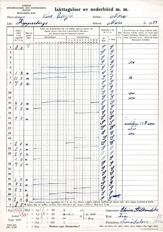 Förstora bildenNederbördsjournal från Ulvsjö för mars 1951. Snödjupet 187 cm angivet i form av en anteckning i journalen.