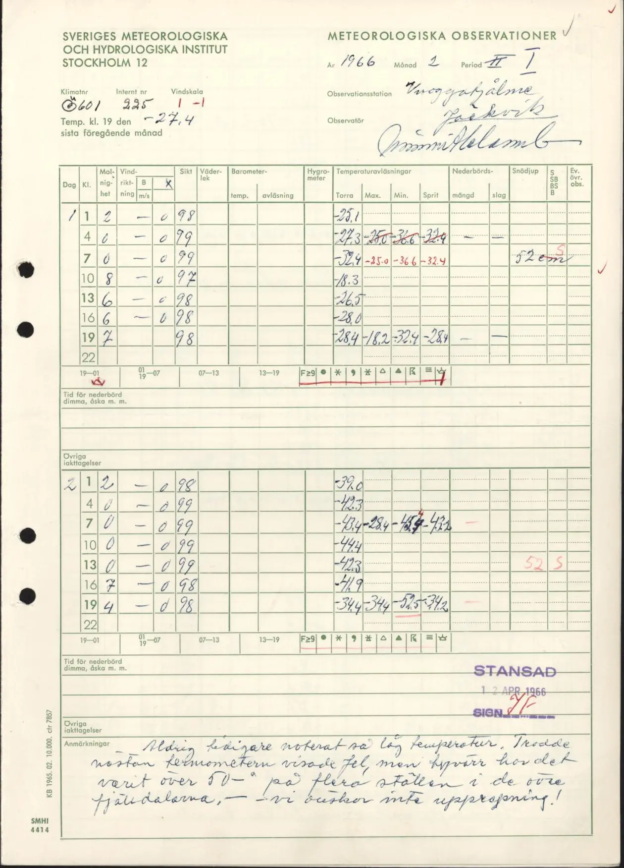 Förstora bildenObservationsjournal från Vuoggatjålme i februari 1966 inklusive kommentar från observatören "....vi önskar inte upprepning!". Hittills har de blivit bönhörda. Notera att den ursprungliga avläsningen var -52,5°.